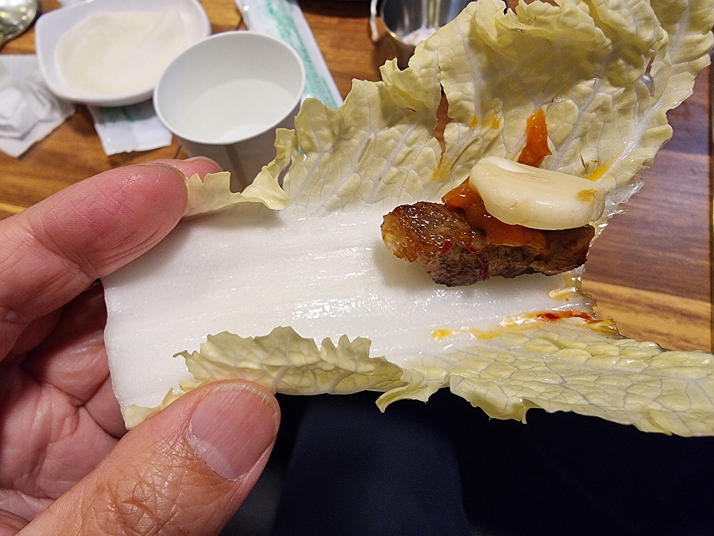 이집의 삼겹살이 워낙 두툼하기 때문에 결대로 가로로 썰어 익히는 것이 아니라 세로로 토막을 만들 듯 그렇게 잘라 구워 먹었다. 마치 스테이크를 썰어 놓은 모양이었다. 거기에 다양한 야채를 첨가하는 것이다. 솥뚜껑 위에 올린 삼겹살에서는 기름이 그대로 남아 김치나 야채를 함께 구워 먹기에 적당한 상태가 된다. 이런 방식을 좋아한다. 고기도 고기지만 거기에 이런 저런 아이템을 함께 구워 먹는 것이야 말로 잔치 분위기를 만들어 주는 푸짐한 밥상을 만들어 준다. 그리고 맛도 좋다. 술 안주로도 아주 그만이다. 여긴 특이하게 가지와 호박도 함께 올려주었다. 다채롭다.