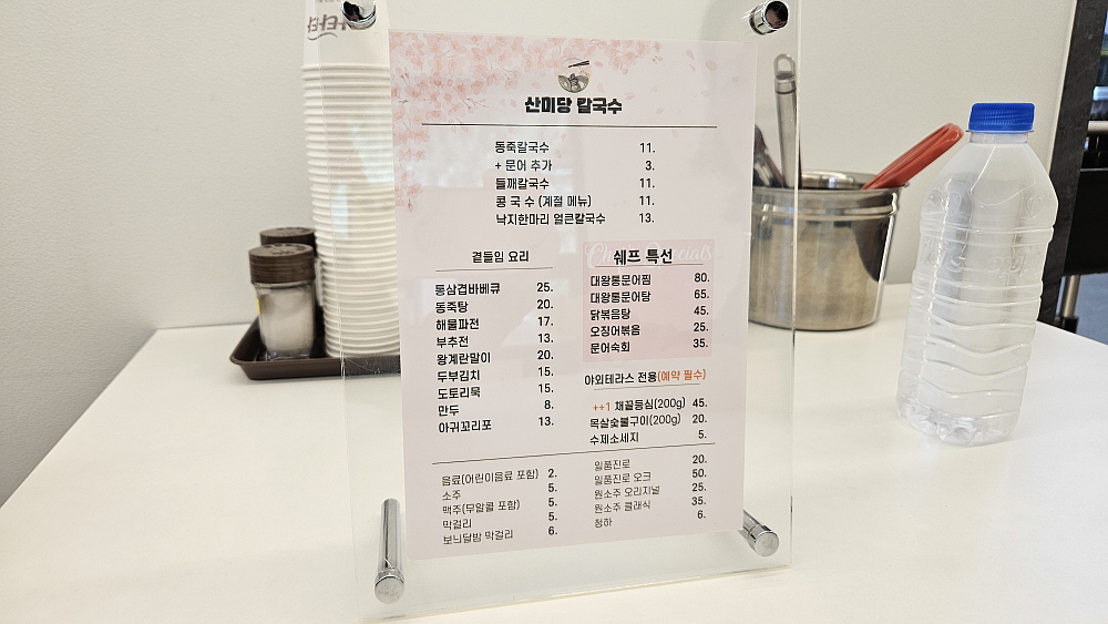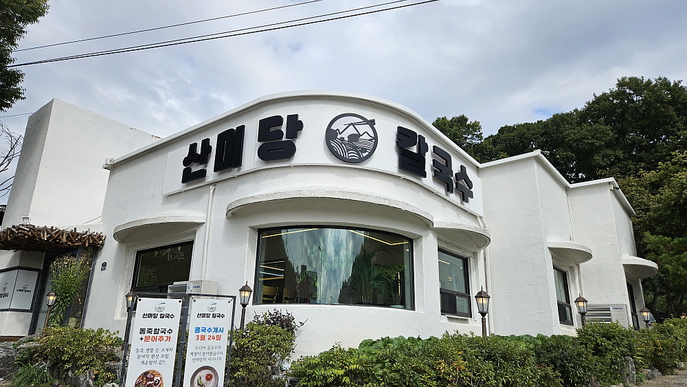 수원 출장을 가면 거의 인재교육원 방향으로 가게 된다. 이날도 그랬다. 그런데 우연한 기회에 교육원 뒤가 유명한 등산코스라는 것을 알게 되었다. 커다란 사찰도 있고, 분위기 좋은 카페와 실력있어 보이는 식당도 제법 많았다. 평일 낮인데도 이곳을 찾는 사람들이 꽤나 많았다. 우리는 예전에 봐 두었던 칼국수 집으로 갔다. 이름은 '산미당 칼국수' 이다. 산미당? 이건 무슨 뜻인지 잘 모르겠네... 아무튼 거의 산 부근 가까이에 있는 집으로 아주 깔끔한 겉모습이 맘에 들었다. 우린 자연스럽게 식당 안으로 들어갔다. 뭔가 관광지 비슷한 곳에 온 것 같은 느낌이 물씬 드는 집이었다.