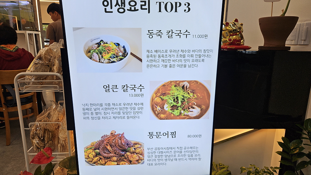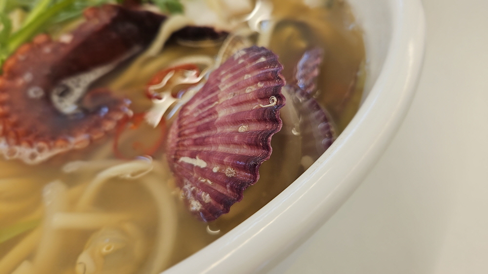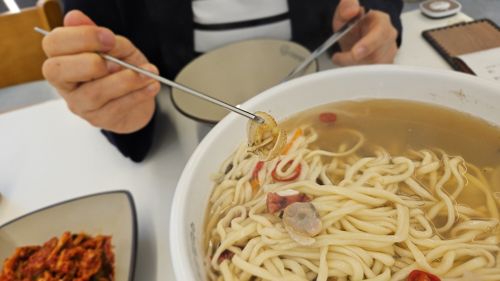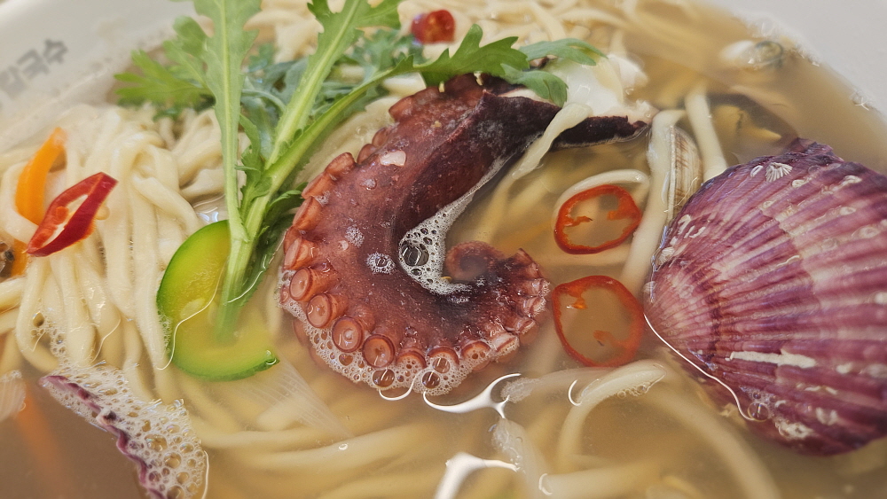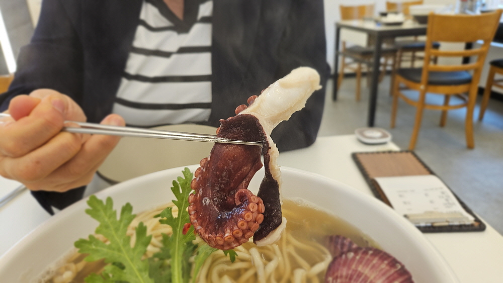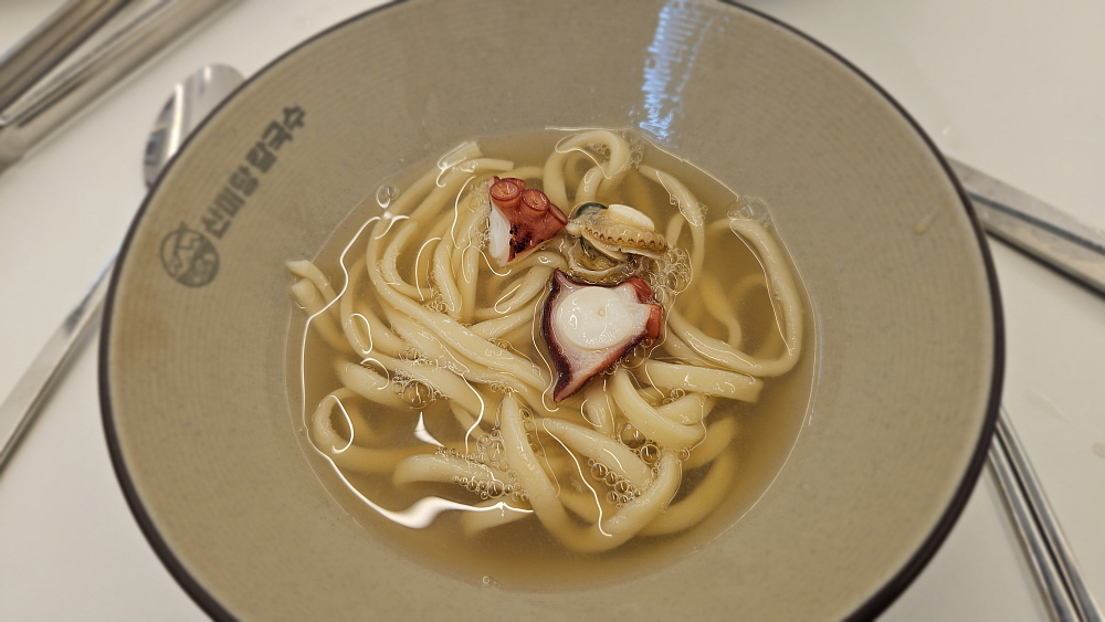 밖에서 볼 때는 몰랐는데 들어가 보니 여긴 동죽칼국수를 파는 곳이었다. 동죽으로도 칼국수 국물을 낼 수 있다는 사실이 놀라웠다. 하긴 동죽도 조개인데 왜 안 되겠는가! 실내도 가게 밖처럼 아주 깔끔하고 산뜻한 분위기였다. 특이하게도 종업원들이 거의 다 외국인들이었다. 혹 식당 주인도 외국인일까? 수원에 이렇게 외국인들이 많다는 사실을 이번에 처음 알게 된 것 같다. 우리는 동죽칼국수 2인분과 3천 원을 더 내고 문어를 추가했다. 문어의 귀한 몸값에 비하면 3천 원이라는 가격이 놀라울 정도로 저렴한 편이라 그냥 조그만한 문어 몇 조각이 들어가는 줄 알았다.