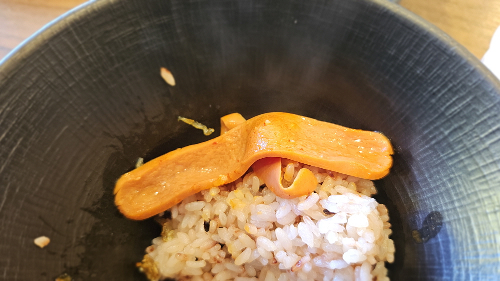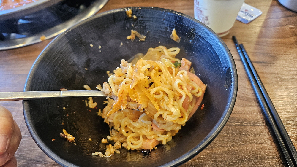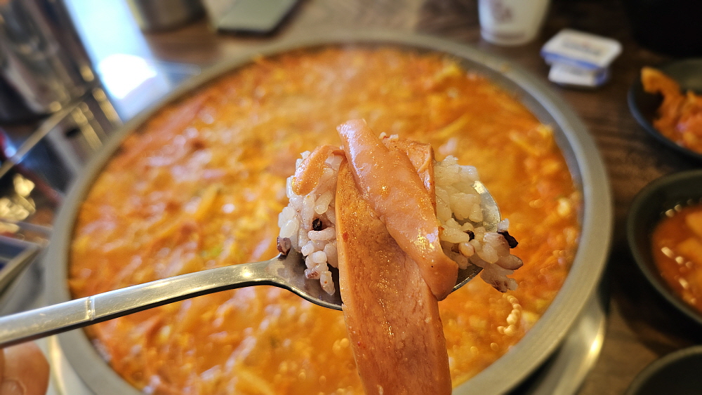 라면사리를 넣으면 국물이 엄청 진득해진다. 여기도 그랬다. 국물도 더 맛이 좋다. 모르겠다. 개인적인 취향일 수도 있겠지만 맛이 더 좋은 것 같다. 이제 드디어 먹을 시간이다. 밥에 넣은 소시지와 햄 그리고 국물이 함께 어우러지는 순간이다. 거기에 꼬들면이 된 신라면의 사리가 맛을 업그레이드 시켜준다. 참 괜찮은 맛이다. 그리고 점심 한 끼로는 너무나 든든한 구성이다. 소시지가 다른 집들과 다른지는 잘 모르겠지만 맛이 그렇게 강하지는 않았다. 다만 국물에 소시지맛이 농축되어 들어가긴 한 것 같았다. 밥이 그냥 마구 들어갔다. 역시 한국 사람들은 찌개와 국물이 있어야 한다.