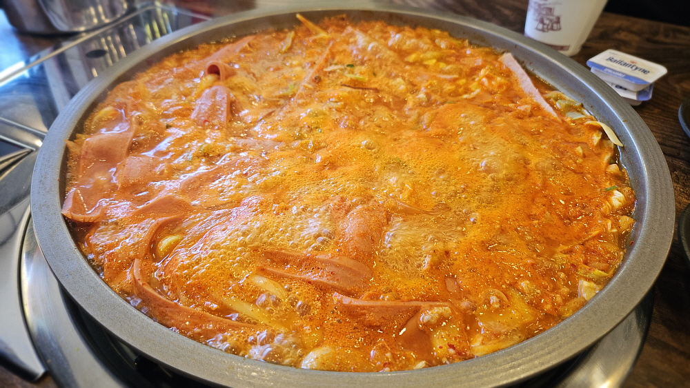 이곳의 부대찌개는 맑은 육수가 특징이다. 그래서인지 속이 훤히 보였다. 잠시 기다리는 시간이 필요했다. 어느 정도 찌개가 끓어야 우리가 알고 있는 부대찌개의 비주얼이 되는 곳이다. 그리고 국룰처럼 꼭 넣어야 하는 것이 있는데 바로 라면사리이다. 그런데 이집의 특징이 여기 하나 더 있다. 부대찌개에 들어가는 라면사리가 신라면이란다. 그냥 사리면을 넣으면 될텐데 왜 굳이 비싼 신라면을 사리로 넣을까? 그 이유는 잘 모르겠지만 이렇게 면만 사리로 넣다보니 스프를 원하는 사람은 마음대로 가지고 가라는 바구니가 따로 있다. 남은 스프들을 이렇게 처리하는 모양이다.