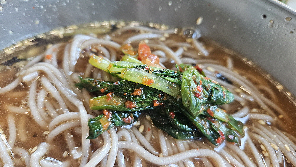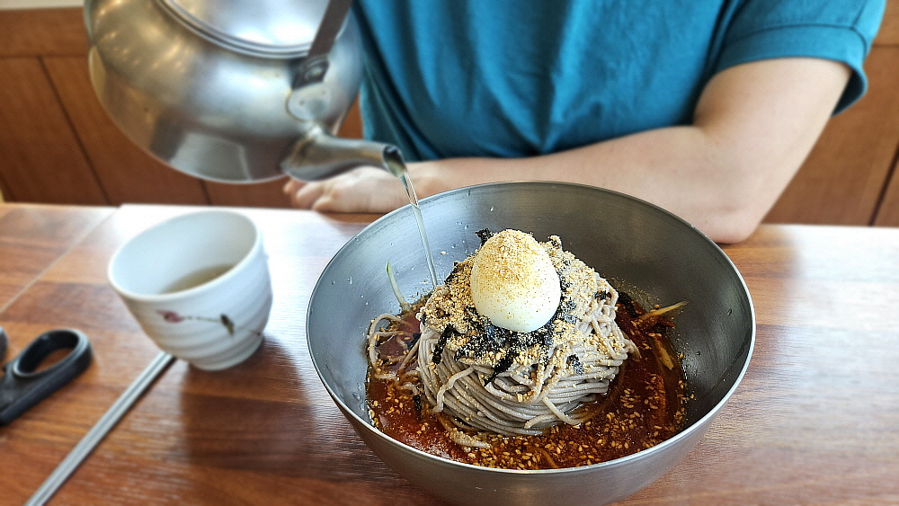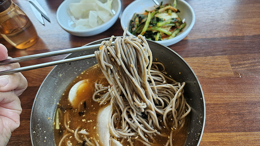 마당에 살구나무가 엄청 많았고, 사람 손이 닿는 곳에도 살구들이 많이 달려 있었다. 계절이 이젠 그런 시절인 것이다. 처음엔 매실인줄 알았는데 가까이 가서 보니 살구였다. 잘 익은 살구도 참 맛이 좋은데 말이다. 우린 비빔과 물 막국수를 주문했다. 늘 있는 일상적인 루틴이다. 이집은 면수를 내어주는데 아주 맛이 잘 밴 메밀차의 맛이다. 이런 것이 좋다. 몸에 좋고, 입에도 좋고... 값만 싸다면 더 좋을텐데 여기도 한 그릇에 만 원이다. 얼마 안 있어 막국수가 나왔는데 이런 비주얼도 양양의 동해막국수와 닮았다. 분명 무슨 사연이 있을 것이다. 맛도 그랬다. 간장 베이스의 양념은 인근에서는 보기 드문 것이다.