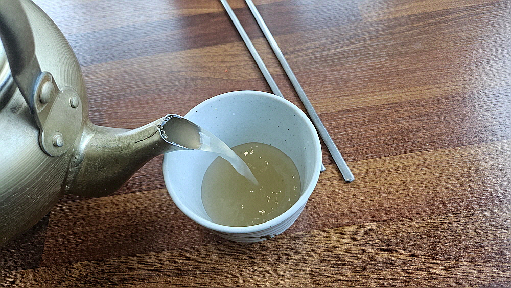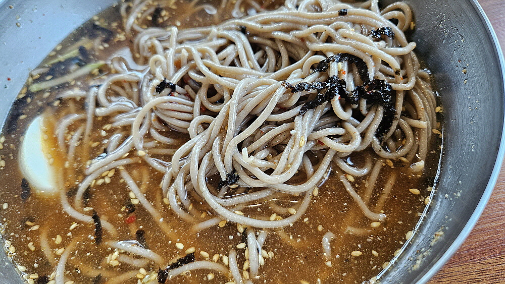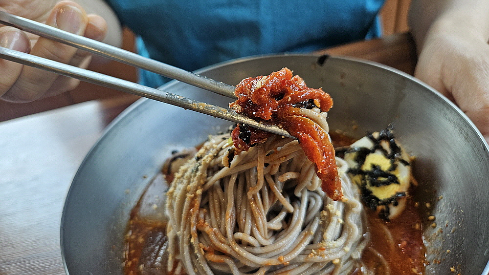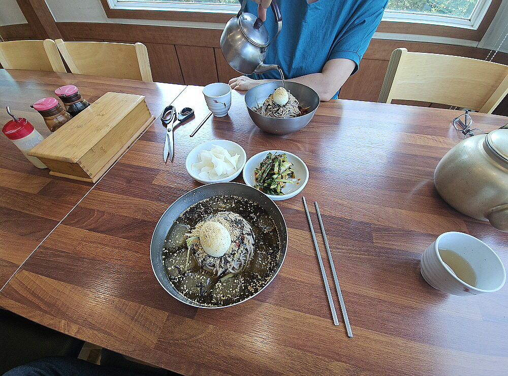 마당에 살구나무가 엄청 많았고, 사람 손이 닿는 곳에도 살구들이 많이 달려 있었다. 계절이 이젠 그런 시절인 것이다. 처음엔 매실인줄 알았는데 가까이 가서 보니 살구였다. 잘 익은 살구도 참 맛이 좋은데 말이다. 우린 비빔과 물 막국수를 주문했다. 늘 있는 일상적인 루틴이다. 이집은 면수를 내어주는데 아주 맛이 잘 밴 메밀차의 맛이다. 이런 것이 좋다. 몸에 좋고, 입에도 좋고... 값만 싸다면 더 좋을텐데 여기도 한 그릇에 만 원이다. 얼마 안 있어 막국수가 나왔는데 이런 비주얼도 양양의 동해막국수와 닮았다. 분명 무슨 사연이 있을 것이다. 맛도 그랬다. 간장 베이스의 양념은 인근에서는 보기 드문 것이다.