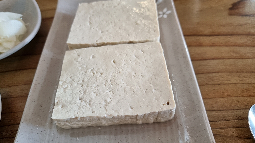 대부분의 막국수집들이 그렇듯 여기도 겨울엔 아무래도 철이 아닌 모양이다. 한창 점심시간이지만 실내엔 두 팀의 손님밖에 없었다. 이런 쌀쌀한 날씨에 막국수를 먹겠다고 가는 사람이 어쩌면 이상한 성격일지도 모른다. 하지만 일단 워낙 막국수를 좋아하니 이런 추위 정도는 이겨내야 한다. 우린 이집의 자랑이라는 명태비빔막국수와 시그니쳐인 물막국수 그리고 두부맛이 좋다하여 모두부 반모도 주문했다. 두부맛이 뭐가 특이할까 만은 그래도 여행의 맛은 맛난 음식인데 강원도 모두부 한 번 먹어봐야 하지 않겠는가? 막국수보다 두부가 먼저 나와 일단 두부와 김치로 에피타이저를 삼았다.