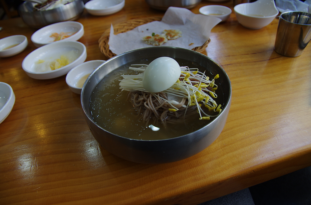 메밀싹을 올려주는 집은 여기가 처음이 아닌가 싶다. 비빔막국수는 엄청 매울 것 같은 강렬한 붉은빛이었다. 하지만 막상 먹어 보면 그리 맵지는 않다. 비빔이라고는 하지만 이것도 참기름을 엄청 넣어 고소함이 더 강하게 다가오는 맛이었다. 물 막국수는 비주얼이 예사롭지 않았다. 먹어보니 정말 그랬다. 이건 막국수라기 보다는 평양냉면에 더 가까운 것이었다. 만일 면만 조금 가늘었다면 이것이 평양냉면이라 해도 믿었을 것이다. 깊고 담백한 육수는 평양냉면 고수들의 맛과 아주 흡사했다. 동두천에서 평양냉면과 막국수의 중간쯤 되는 진정한 강자를 만난 셈이다.