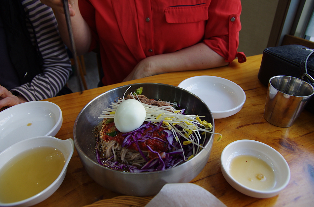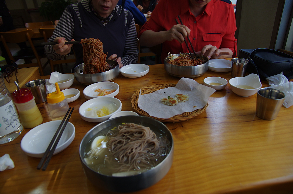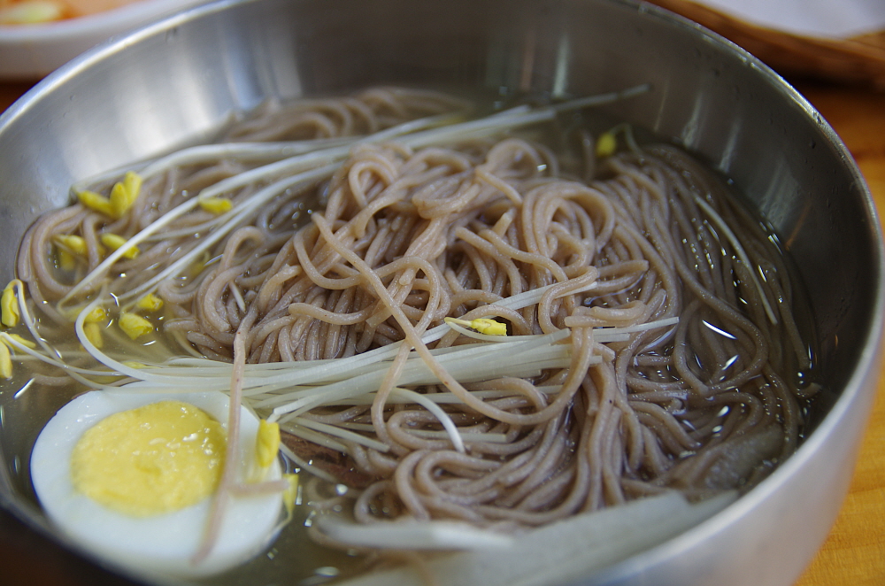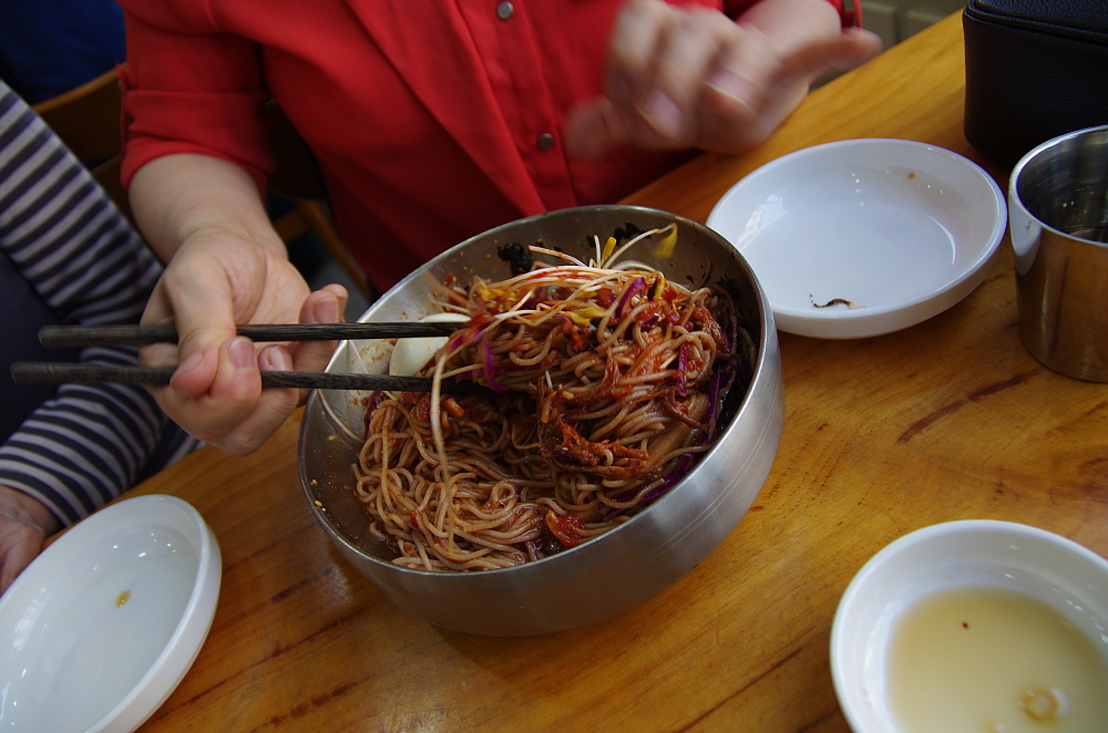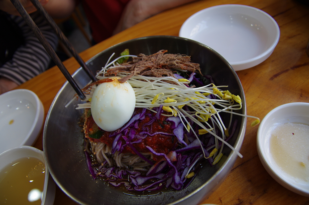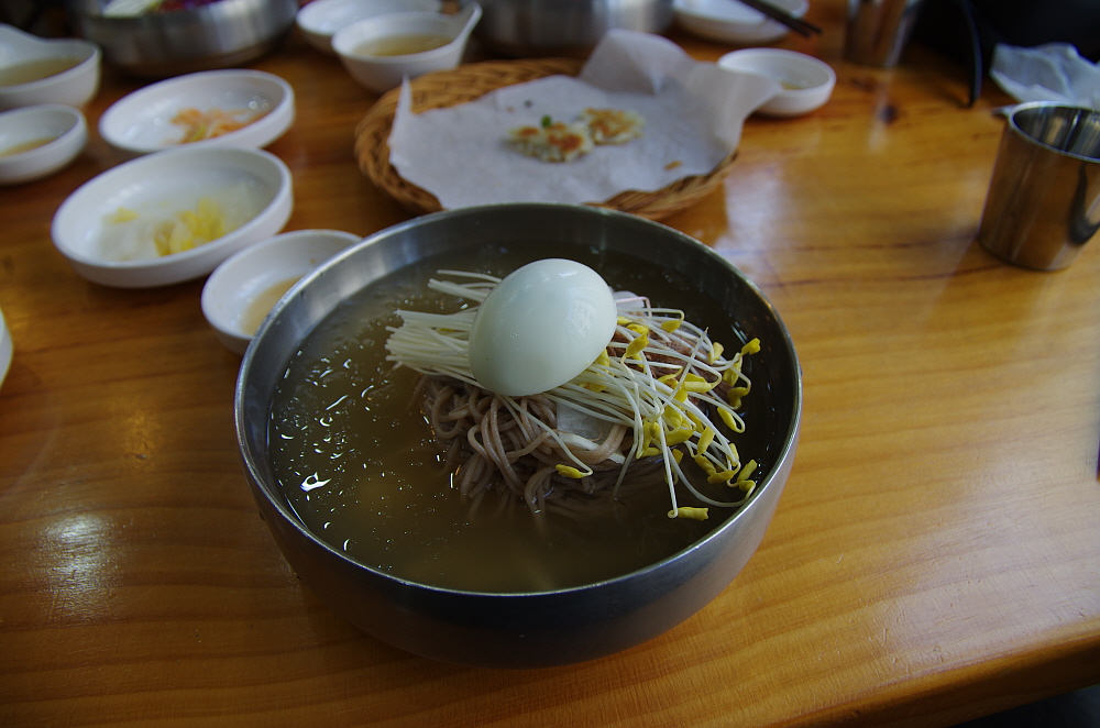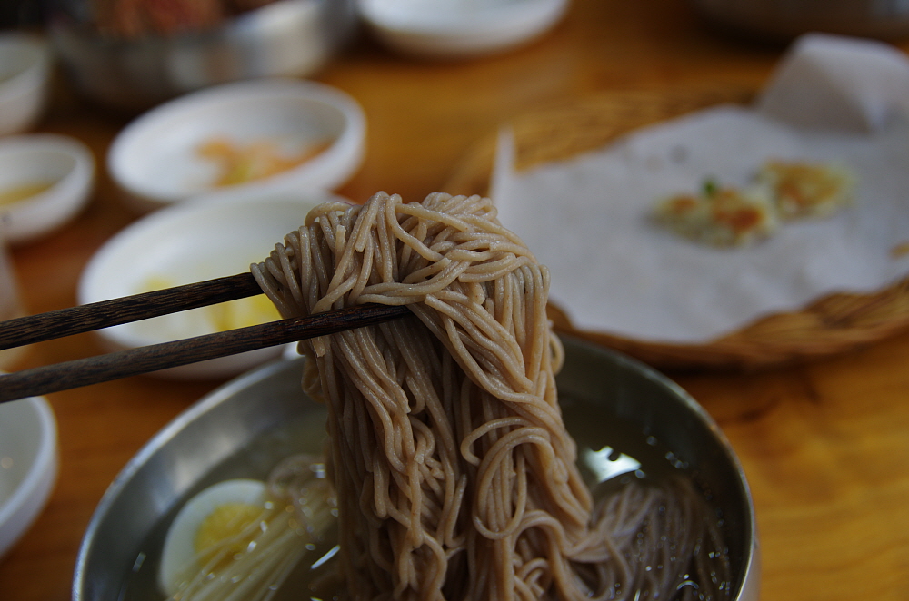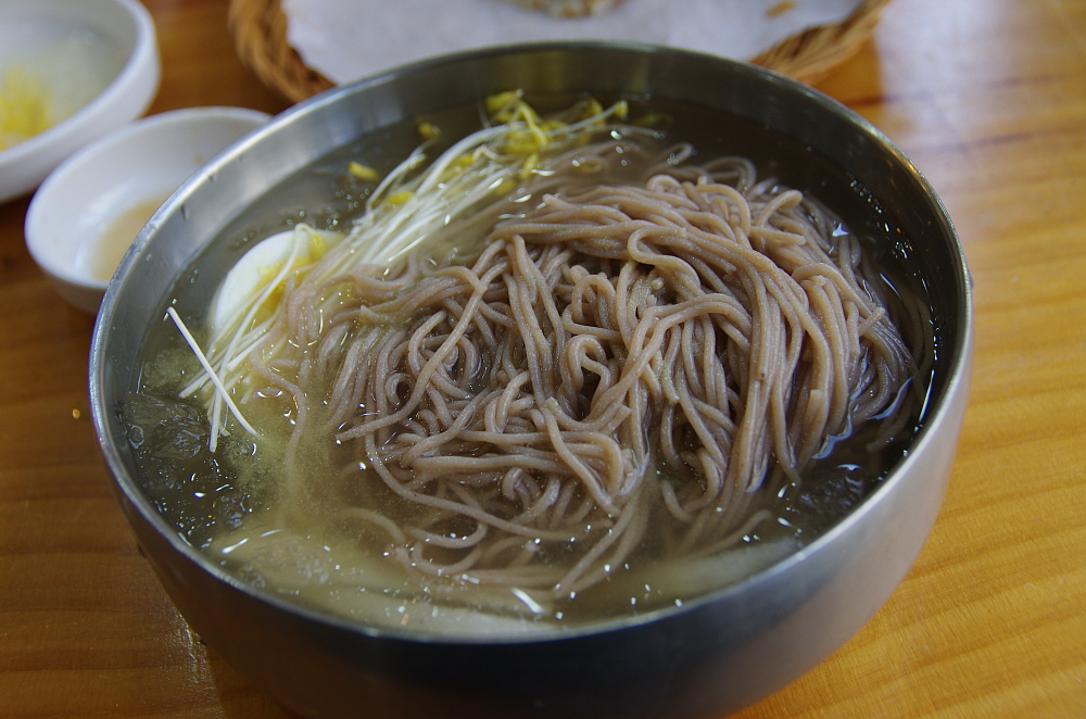 메밀싹을 올려주는 집은 여기가 처음이 아닌가 싶다. 비빔막국수는 엄청 매울 것 같은 강렬한 붉은빛이었다. 하지만 막상 먹어 보면 그리 맵지는 않다. 비빔이라고는 하지만 이것도 참기름을 엄청 넣어 고소함이 더 강하게 다가오는 맛이었다. 물 막국수는 비주얼이 예사롭지 않았다. 먹어보니 정말 그랬다. 이건 막국수라기 보다는 평양냉면에 더 가까운 것이었다. 만일 면만 조금 가늘었다면 이것이 평양냉면이라 해도 믿었을 것이다. 깊고 담백한 육수는 평양냉면 고수들의 맛과 아주 흡사했다. 동두천에서 평양냉면과 막국수의 중간쯤 되는 진정한 강자를 만난 셈이다.