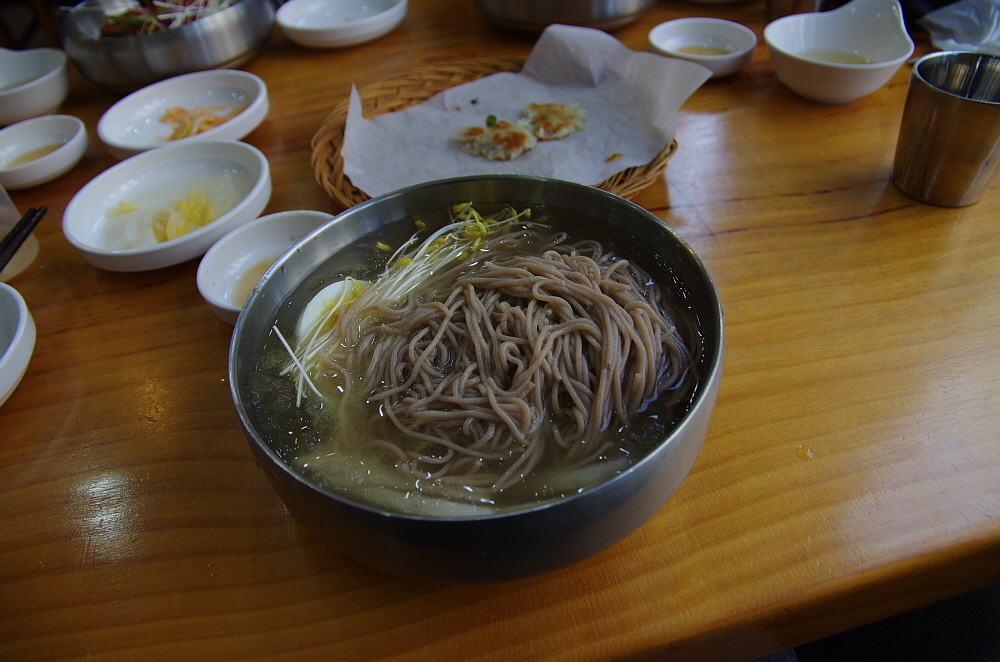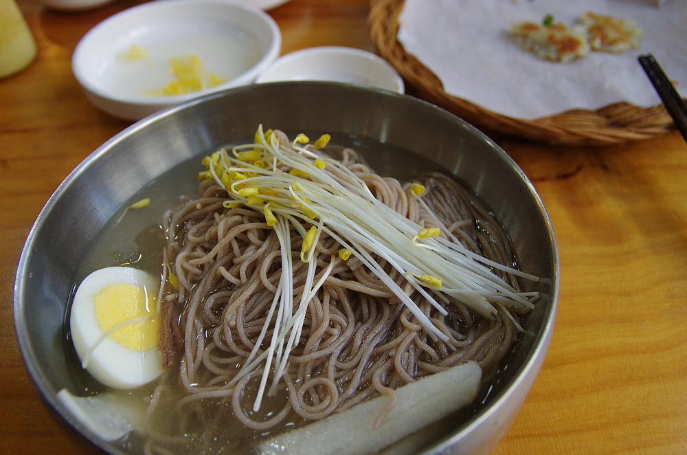 여긴 주문이 들어오며 그때 반죽을 해서 면을 뽑는다고 했다. 아무래도 국수가 나오기까지 시간이 좀 걸린다. 하지만 그만큼 맛있고, 신선하다. 그래서인지 먼저 감자전이 나왔다. 두 장이 나오는데 비주얼을 보면 딱 녹두전처럼 생겼다. 그런데 먹어 보면 감자전이 맞다. 아주 고소하고, 진한 맛이 나는 것이 전 전문점의 그것보다 더 낫다 싶었다. 기름을 듬뿍 두르고 붙어낸 감자전의 고소함은 막국수의 쌉쌀한 메밀맛과 아주 잘 어울리는 것이 맞다. 감자전을 먹고 있노라니 드디어 오늘의 주인공 막국수가 나왔다. 정말 특이한 것은 메밀싹을 고명으로 올려 준다는 것이다.