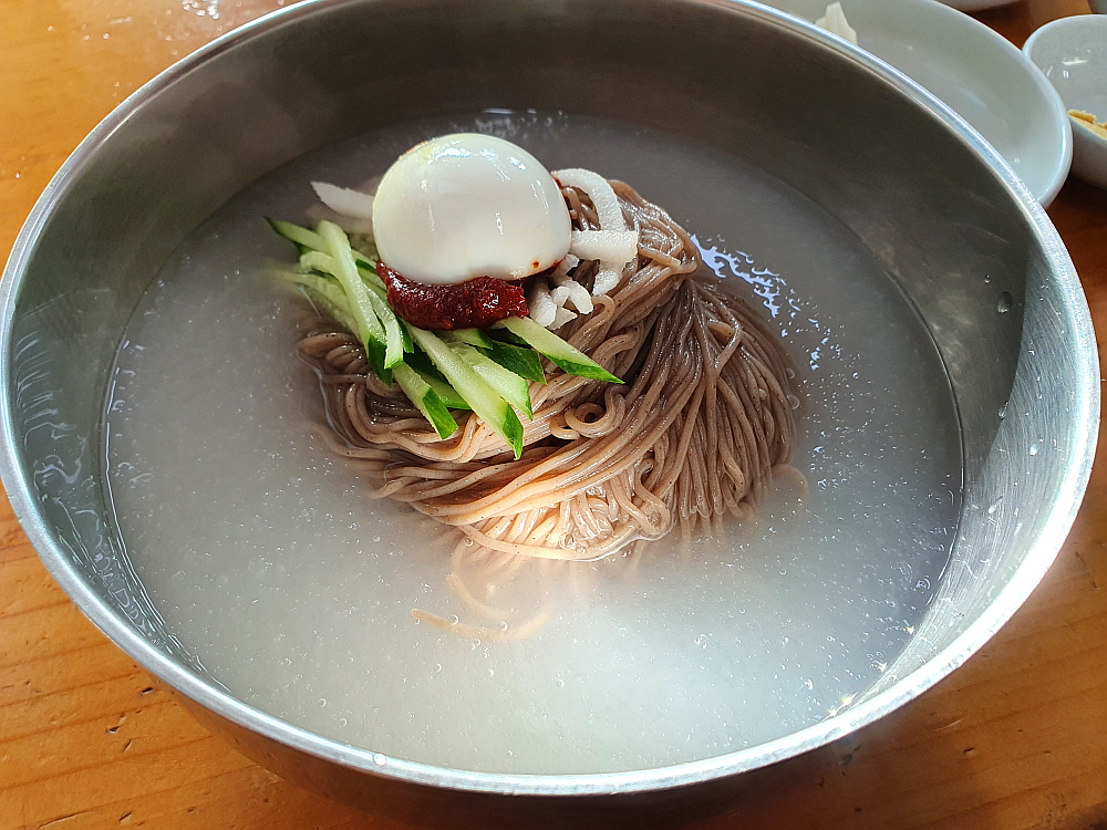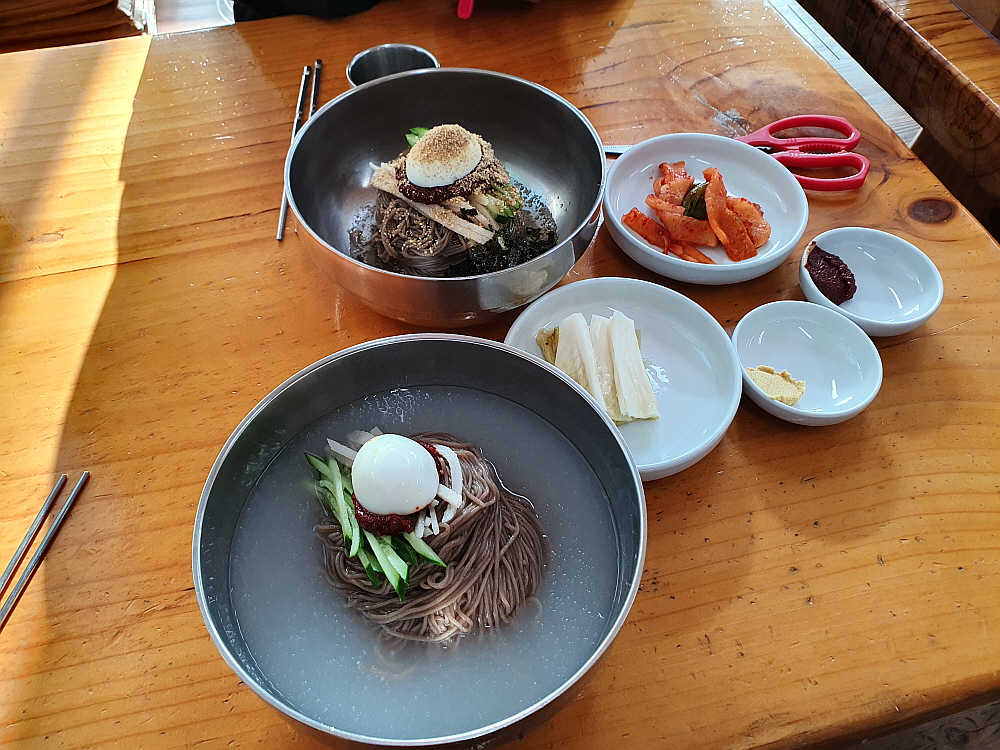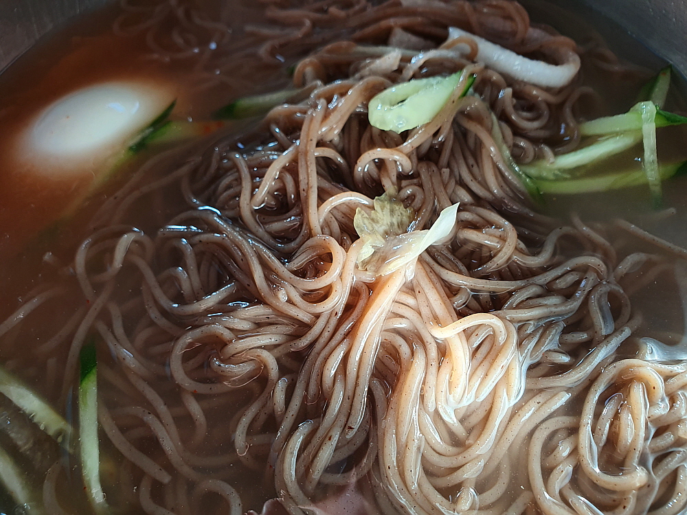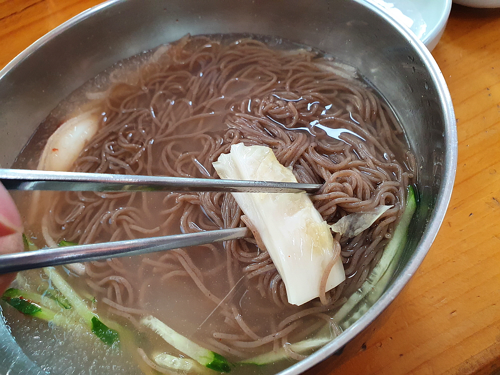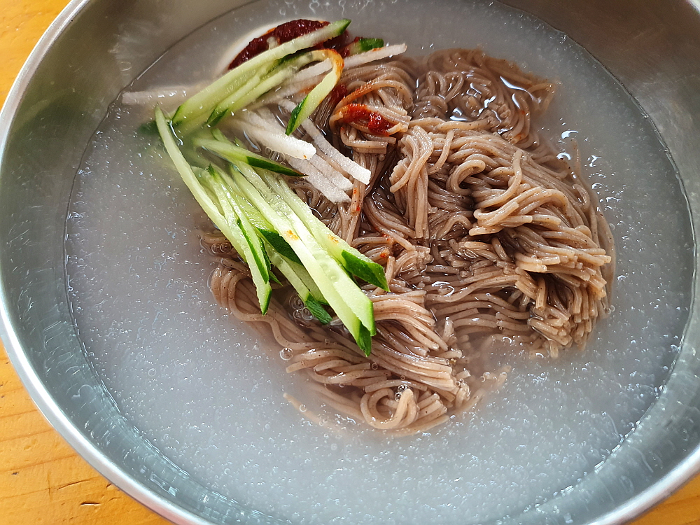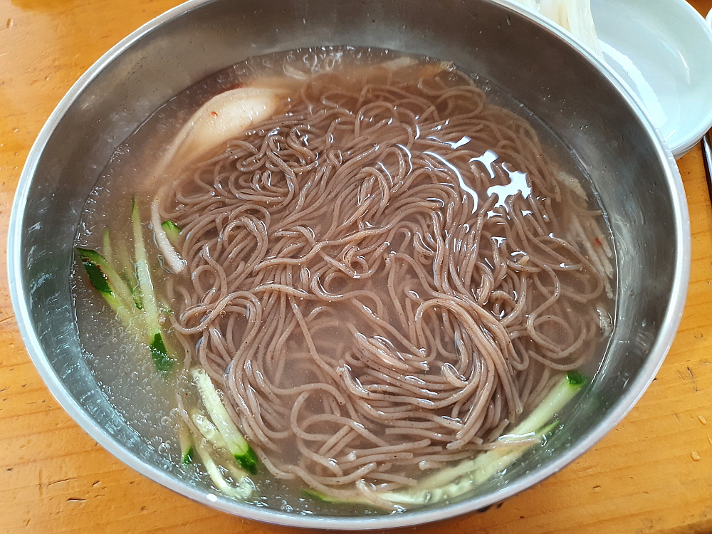 그 말이 맞았다. 나온 막국수는 정말 양이 많았다. 보통 한 그릇 뚝딱 비우고 나면 좀 아쉽기 마련인데 여기서는 그럴 필요가 없었다. 사실 조금 남기기까지 했다. 겨울이라 더 많이 준 거 같기도 하고 암튼 다른 집들에 비해 분명 많은 양이었다. 물 막국수는 좀 전에 맛 본 육수처럼 고기 국물이 진한 평양냉면 같는 맛이 났다. 이건 막국수라기 보다는 평양냉면이라고 해야 할 것 같았다. 비빔은 참기름 향이 진하게 배어 있는 전형적인 비빔 양념장 맛이 좋았는데, 이것 만큼은 함흥냉면 같은 맛이 아니라 뭐랄까 칡냉면 비슷한 맛이라고 할까 암튼 좀 특이했다. 결과적으로 보면 물 보다는 비빔이 더 맛이 좋았다.