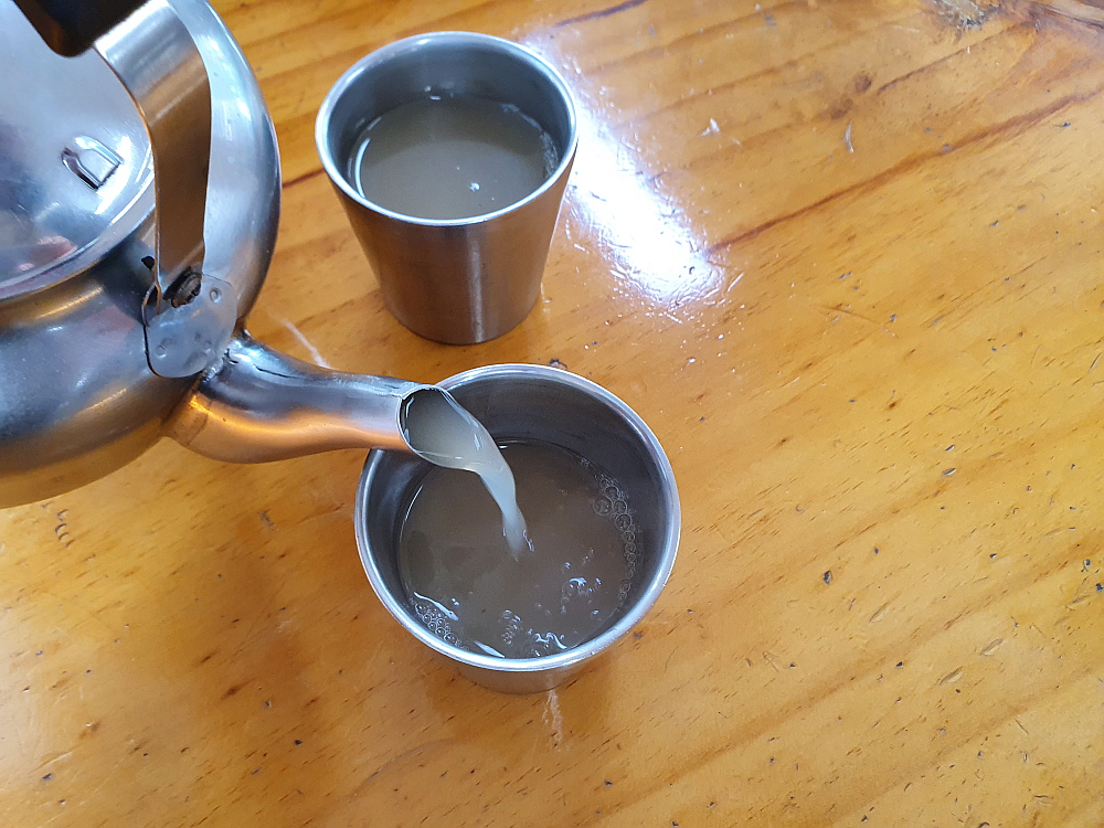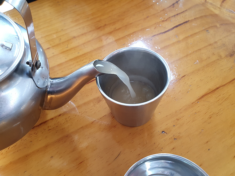 어쨌든 왔으니 맛나게 먹기만 하면 된다. 우리는 물과 비빔막국수를 주문했다. 늘 그렇듯이... 이집은 냉면집처럼 처음 들어가면 먼저 구수한 고기 육수를 한 주전자 갖다 준다. 아마 손님들이 많이 찾았는데 정말 주전가 한 가득 갖다 주었다. 그 맛이 고소하고, 진한 것이 괜찮았다. 보통 막국수는 동치미 국물을 주로 사용하지만 이렇게 고기 육수가 들어가면 아무래도 더 진하고 고급진 음식이 되는 것이다. 블로그 리뷰를 보면 이집은 양이 많다는 말이 있는데 그래서 우린 다른 메뉴는 시키지 않고, 일단 막국수에 집중하기로 했다.