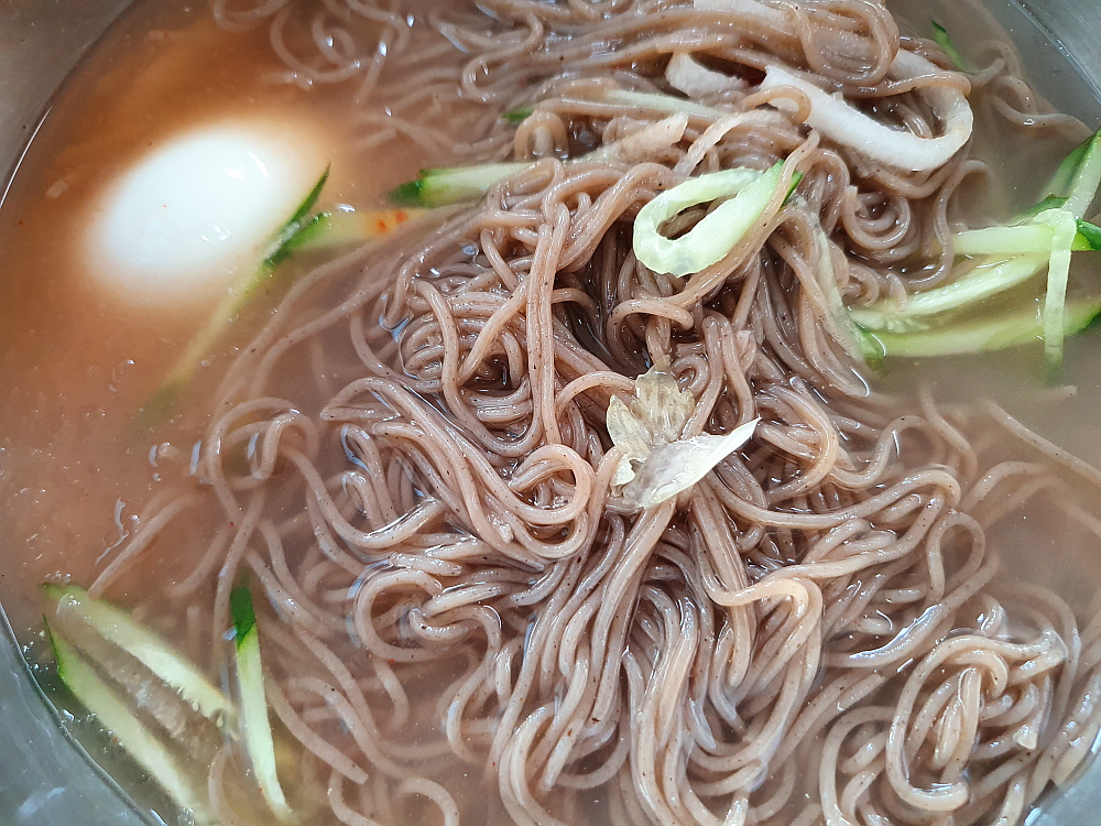 하지만 아무리 내가 막국수 매니아라 해도 이런 계절에 얼음이 동동 떠 있는 차가운 육수를 들이키니 몸 속이 온통 얼어붙는 느낌이 들었다. 아무래도 한 겨울에 얼음 동동 막국수는 무리인가 싶다. 하지만 어쩌랴 입에선 자꾸 들어 오라고 재촉을 하니 말이다. 이런 맛이 또한 한국 사람들의 막국수 사랑이 아니겠는가? 어릴적 생각해 보면 이런 비슷한 광경 자주 겪었었다. 어머니는 추운 겨울 밤 항아리에 들어 있는 얼음 떠 있는 동치미 국물을 떠 오셔서 국수와 말아 주시곤 했다. 이것이 그것과 비슷한 상황 아니겠는가?