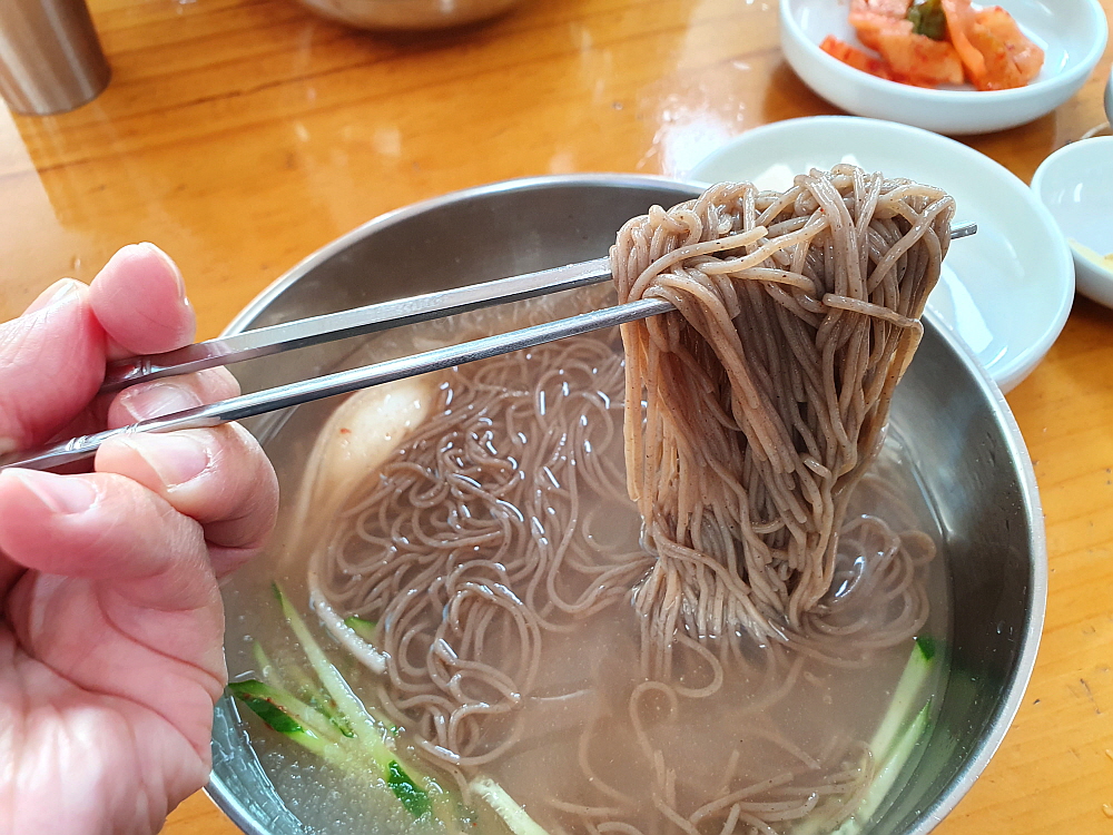 이 계절이라 비빔 막국수가 더 입에 잘 붙었는지 모르겠다. 아무튼 우리 입맛엔 그랬다. 비빔 막국수는 어디서도 잘 먹어 보지 못한 묘한 맛이었다. 다만 두 국수 모두 면은 조금 아쉬웠다. 100% 메밀이 들어간 알싸한 메밀 향을 기대했는데 아무래도 봉평 막국수 같이 체인점들이 파는 막국수 면처럼 뭔가 첨가된, 그래서 농도와 찰기를 맞춘 면이라 기대와는 조금 다른 것이었다. 하긴 이런 면이 더 많긴 하다. 100% 메밀가루로만 면을 만드는 곳이 흔한 것은 아니니 말이다. 아무튼 육수와 비빔 양념은 정말 괜찮았다. 아마 그래서 현지 사람들의 입맛에도 잘 맞는 모양이다. 역시 내공있고, 오랜 세월 보낸 노포의 힘이라 하겠다.