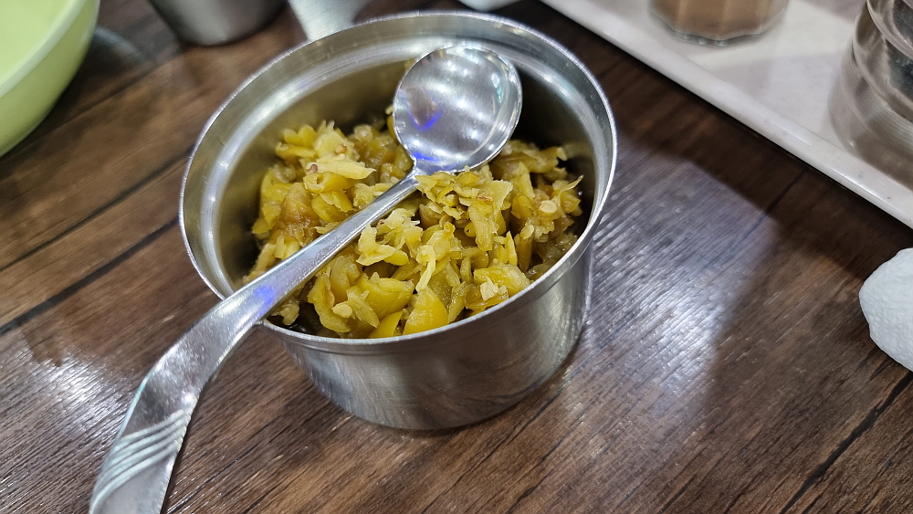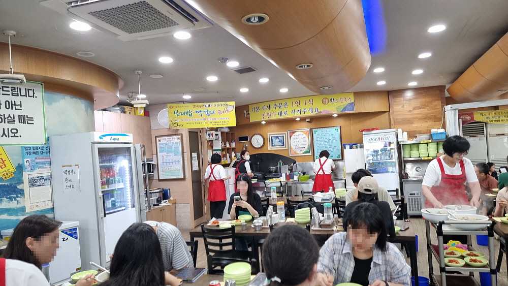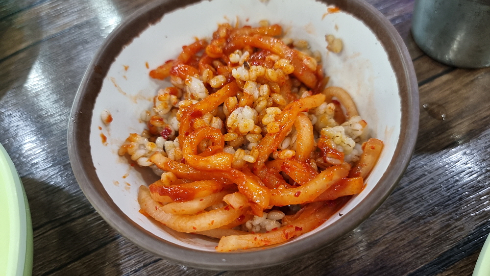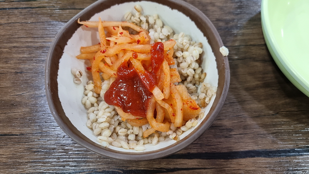 정확한 관계는 모르겠지만 여기나 길동에 있는 황도나 인테리어나 영업방식이 비슷했다. 아마도 같은 계열의 식당이 아닐까 싶었다. 손님이 직접 보리밥을 가져다 먹는 방법도 같았다. 마침 우리가 간 이날 칼국수의 가격이 11,000원에서 12,000원으로 인상되었다고 했다. 재수가 없는 것일까? 아무튼 인상된 첫 날이라 그런지 직원들이 손님들에게 아무래도 더 잘하는 것 같았다. 꽁보리밥에 무채나물을 올리고 참기름 살짝 두른 후 고추장으로 비벼 먹는 아주 단촐한 비빔밥이 이집의 특징이다. 그런데 이게 또 맛이 괜찮다. 중독성이 있다.