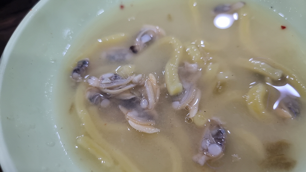 김치도 리필이 되고 보리밥에 넣어 먹은 무생채도 리필이 된다. 우리는 김치보다 오히려 무생채가 더 맛이 좋아서 그것을 가져다 먹었다. 크기는 작지만 먹으니 나름대로 맛이 나는 바지락으로 왕창 건져 알을 다 빼고 한꺼번에 먹었다. 바지락은 해감을 잘 해야 하는 법인데 약간 찌꺽거리는 느낌이 있었다. 워낙 많은 양의 바지락을 손 보려면 어느 정도 부족한 면도 있으리라... 해감이 잘 안 된 바지락의 식감 때문에 아예 바지락을 먹지 않는 사람도 있다. 그만큼 바지락은 먹기에 까다로운 면이 있다. 하지만 국물은 다른 어떤 조개도 따라오지 못할 그런 맛이다.