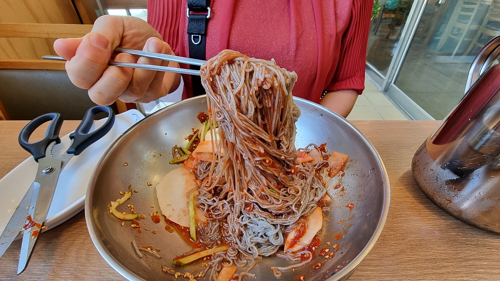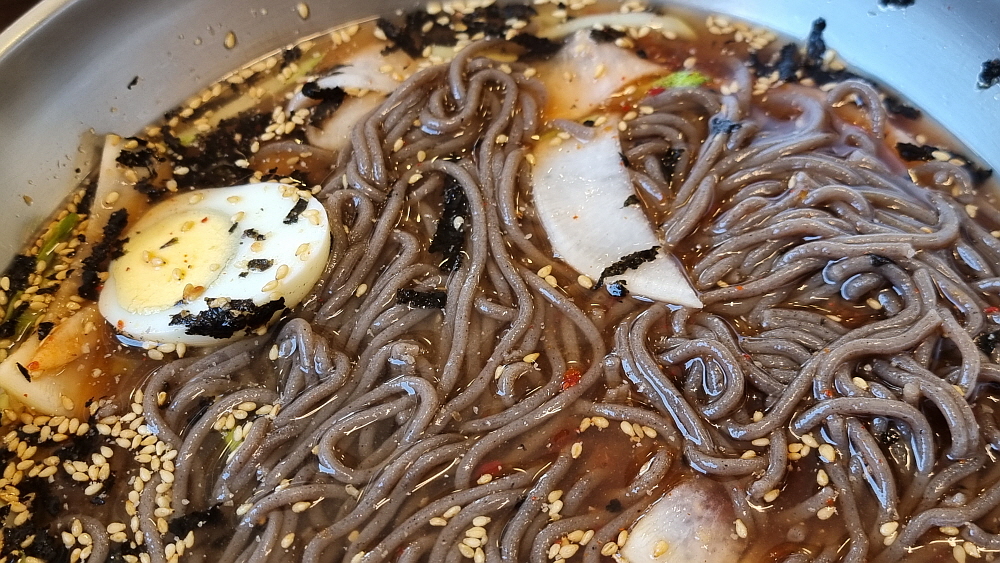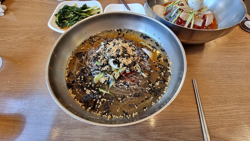 이집은 특이하게 냉면과 막국수를 함께 파는데 가격이 같았다. 보통은 냉면의 가격이 더 비싸기 마련인데 말이다. 우리는 물막국수와 비빔냉면을 주문했다. 뭔가 다를 것 같지만 비슷한 형제 지간인 냉면과 막국수를 모두 맛 볼 수 있을 것이라 생각했다. 점심시간이라 그런지 실내는 손님들이 제법 있었다. 나이가 지긋한 사람들이 많았는데 아무래도 막국수라는 음식이 젊은이들이 열광하는 아이템은 아닌지라 이렇게 어디가나 나이 먹은 사람들이 주로 먹으러 오는 것을 볼 수 있다. 냉면도 마찬가지다. 여기서 맛나게 먹었다는 감자옹심이도 먹고 싶었지만 일단 이날은 이것으로 만족하기로 했다.