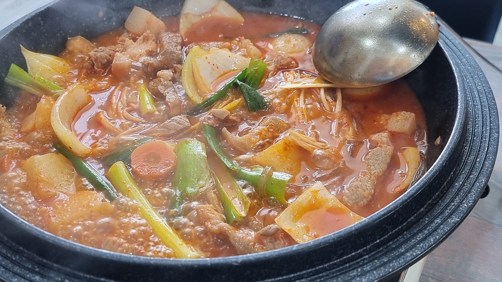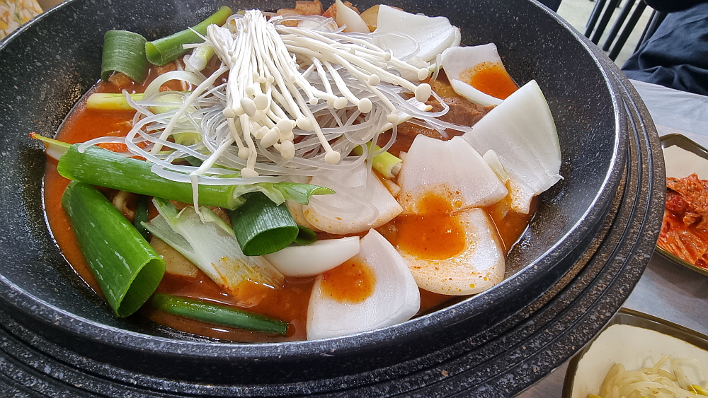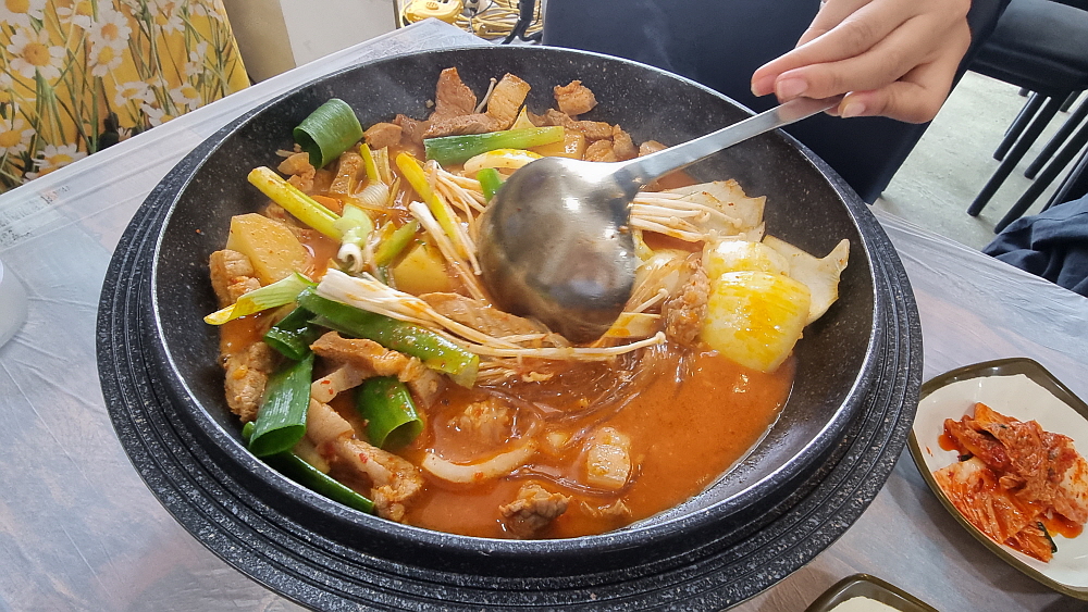 짜글이라는 말을 들으면 의례 사람들은 당연히 김치가 들어 있을 것이라 생각한다. 우리도 그랬다. 하지만 여기선 김치를 볼 수 없다. 말 그대로 그냥 돼지고기와 양념을 졸여 먹는 짜글이였다. 물론 약간의 야채가 있긴 하다. 하지만 김치가 없는 짜글이를 먹게 될 줄은 몰랐다. 그리고 어느 정도 국물이 졸여졌을 때 먹으니 어디선가 많이 먹어 본 아주 익숙한 맛이었다. 과연 이 맛을 어디서 봤을까? 몇 번 더 먹어보니 이것은 그냥 닭볶음탕, 즉 닭도리탕의 양념이었다. 그랬다. 메뉴에도 닭도리탕이 있으니 그 양념을 사용한 것이리라. 돼지고기로 만든 짜글이지만 맛은 닭도리탕이었다는...