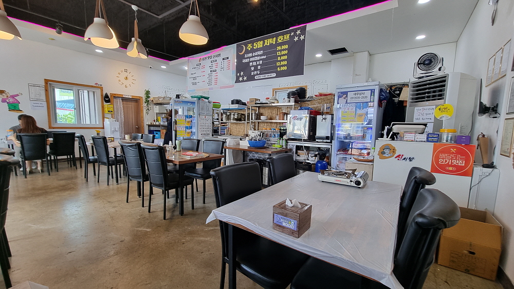 막상 안에 들어가 보니 밖에서 볼 때보다 깔끔하고 뭔가 색다른 분위기였다. 정말 특이한 것은 간판에는 신서방이라 되어 있지만 저녁엔 조서방이 호프집을 한단다. 그래서 메뉴도 아예 다른 두 가지가 있다. 뭔 관계일까? 혹 동서지간일까? 그렇다면 여기서 일하는 여자 두명이 자매라는 말이 되나? 암튼 이런 한 점포 내에 두 가게인 곳은 보기 드문 일이라 좀 신기했다. 정말로 밤에 와서 호프집도 한 번 이용해 보고 싶은 생각이 강하게 든다고 해야할까? 우리는 돼지고기 짜글이를 주문했다. 나중에 먹으면서 알게 된 사실인데 처음 기대한 것과는 아주 많이 다른 짜글이를 만났다.
