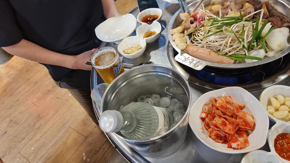 손님 상에 있는 소주도 얼음을 넣은 그릇을 가지고 와서 다시 담궈준다. 시원하게 마시라는 말이다. 이집의 서비스는 어쩌면 다른 식당들의 스탠다드가 되지 않을까 싶다. 이미 첫 생맥주 한 잔에 맘이 다 녹아버려 솔직히 맛이 없다해도 뭐라하기 힘든 상태였다. 곱창이 조금 모자란듯 하여 우린 모듬을 한 개 더 추가하여 먹었다. 보통 곱창집에서는 곱창 추가가 상식인데 여긴 나름 먹을 것이 많아 그러지 않아도 되는 정도였다. 원래 이 곱창 기름에 밥도 볶아 먹어야 하는데 아무튼 우린 참 만족스런 저녁 회식을 할 수 있었다. 이런 곱창집이라면 다시 와야 한다.