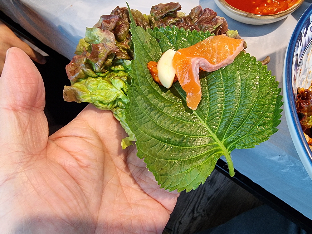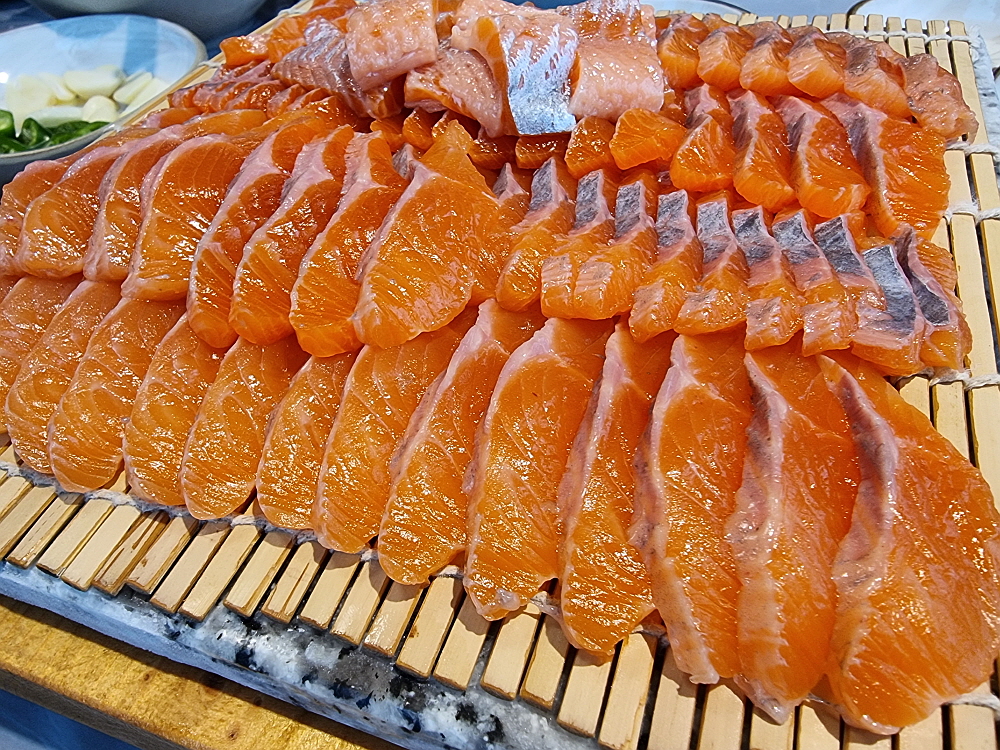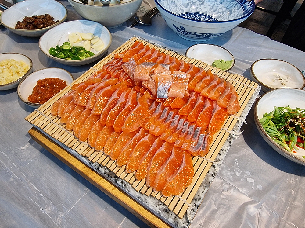 특이하게도 감자떡이 나왔는데 이집에서 직접 만든단다. 이런 정성을 들이다니... 잠시 기다리자니 드디어 오늘이 주인공 송어회가 나왔다. 언뜻 봐도 싱싱하고 색감좋은 맛나 보이는 송어회였다. 이 정도 양이 삼 인분이라니 결코 가격이 비싼 것이 아닌가 보네 하는 반전의 생각이 다시 들었다. 송어회는 먹는 법이 있단다. 먼저 야채와 초고추장, 마늘, 된장 등을 넣고 양념장을 만든 다음에 거기에 회덮밥처럼 송어를 찍어 먹는 것이다. 그런데 이 방법이 아주 훌륭한 맛을 보장해 주었다. 원래 송어회를 이런 방식으로 먹었던가? 하는 기억을 더듬는 시간이 필요했다.