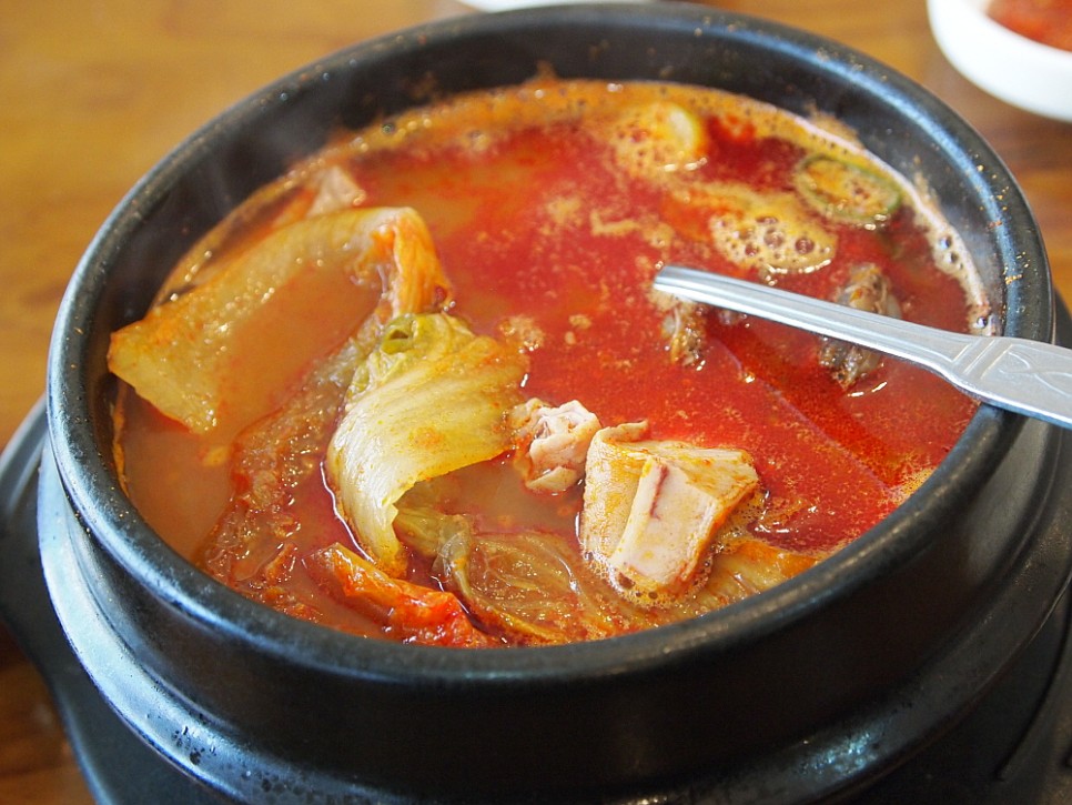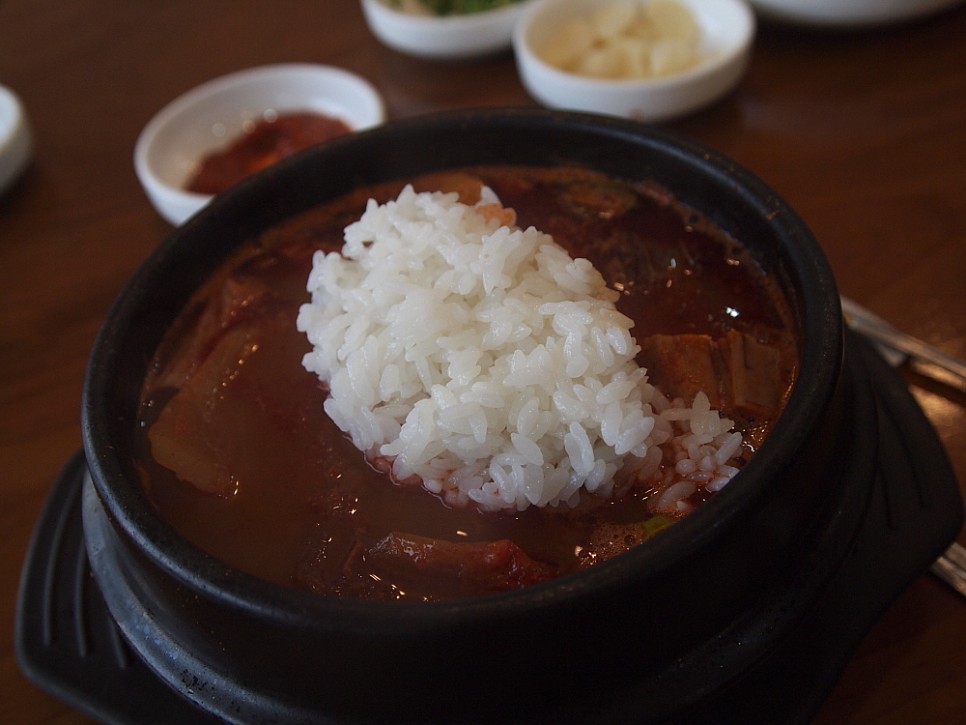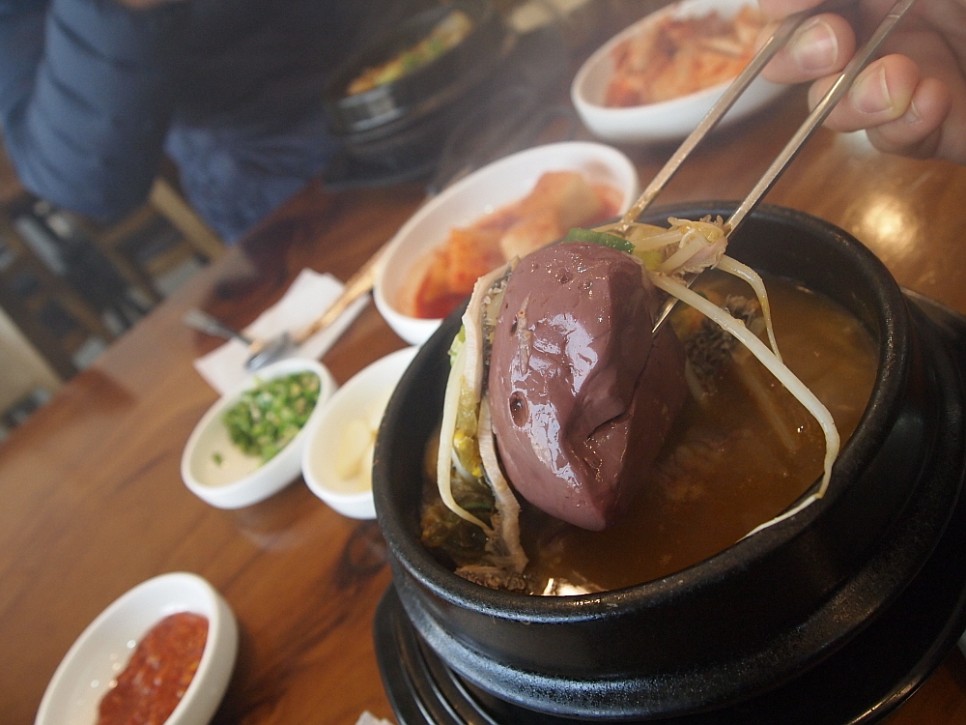 우리는 이집의 시그니쳐 메뉴라는 해장국과 평소 다른 집에선 만나기 힘든 매운 순대국을 주문했다. 평소 매운 음식을 잘 먹지 못하지만 처음 발견한 신대륙을 만나는 흥분으로 이 음식을 주문했다. 메뉴가 단촐한 까닭인지 음식은 바로 나왔다. 사실 이런 음식은 만드는 과정이 힘들고 시간이 오래 걸리지만 막상 손님 상에 오를 때는 충분히 맛이 우러난 국물을 퍼 담아 오는 것이니 당연한 일이다. 정말 특이한 것은 해장국 보다 순대국이 더 뻘건 국물이라는 것이다. 양평 해장국에 익숙한 우리에게 된장국에 가까운 이집의 해장국도 생경한 것이지만, 매운탕 처럼 빨간 국물의 순대국도 참 낯선 것이었다.