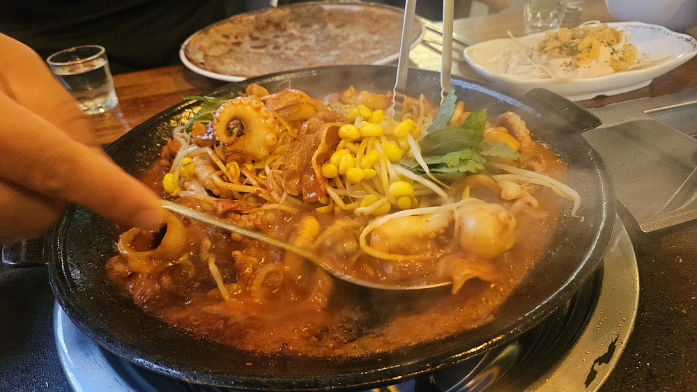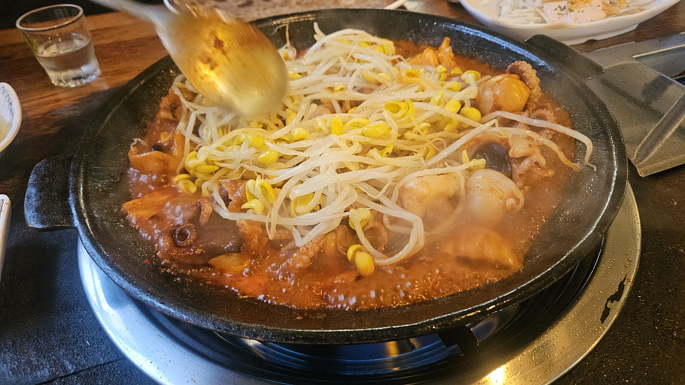 보통은 그냥 쭈꾸미만 주문하지 않는다. 우리도 대패삼겹살과 쭈꾸미가 함께 들어간 세트를 주문했다. 쭈꾸미의 맵기는 가장 덜 매운 것으로 했다. 맵질에게는 보통맛도 고통일 수 있다. 가게 안은 실내포장마차처럼 식당이라기 보다는 술집에 가까운 분위기였다. 적당히 어둡고, 안정적인 분위기인 것이 가족들과 와서 외식을 하는 곳이라기 보다는 우리처럼 동료들과 함께 와서 술 한 잔 하면서 저녁을 먹기에 더 좋은 곳인 거 같다. 다른 메뉴가 없기 때문에 다들 쭈꾸미를 먹고 있었다. 소주 안주로 이만한 것도 없으니 인기가 좋을 수밖에...