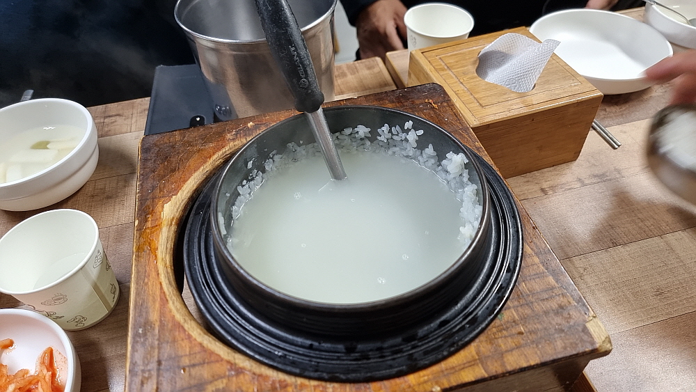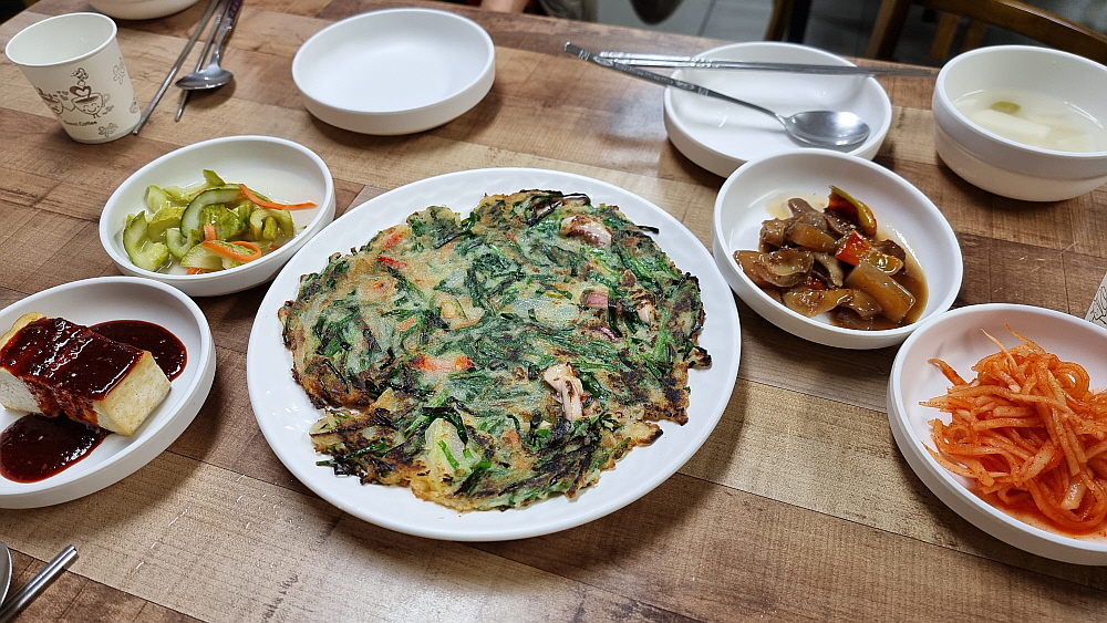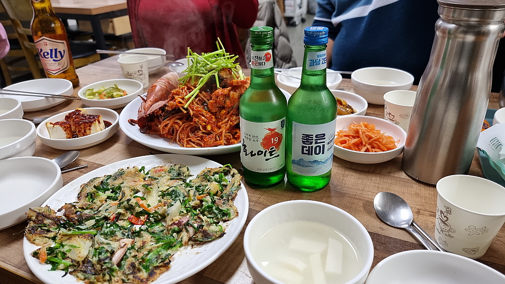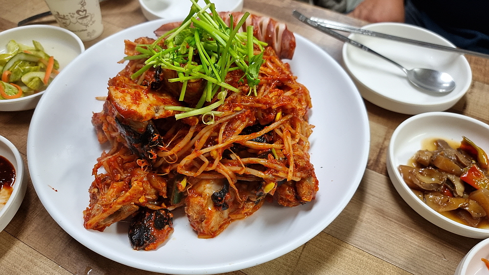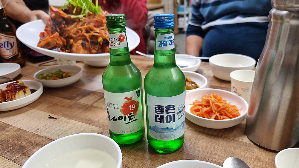 우리는 먼저 나온 해물파전으로 한 잔 하기로 했다. 지역 소주를 달라 했더니 좋은데이와 화이트 라는 술을 가지고 왔다. 좋은데이는 우리네 진로후레쉬 같은 알콜도수가 낮은 술이고, 화이트는 진로의 빨강뚜껑처럼 알콜이 센 술이다. 둘 다 먹어 본 적이 거의 없는 술이다. 먹어보니 좋은데이가 화이트 보다 뭔가 달달하면서 부드러운 느낌이었다. 도수가 낮아서 그런가? 가격에 비해 엄청 푸짐한 해물찜과 해물파전을 보니 일단 가성비에의 만족도는 아주 높은 집이란 생각이다. 반찬의 가지수도 많아 먹는 동안 안주로 부족함은 없었다. 그런데 해물찜의 모양이 좀 우리가 평소 먹던 것과는 많이 달랐다.
