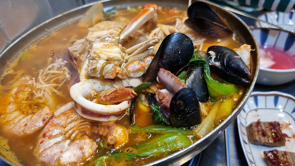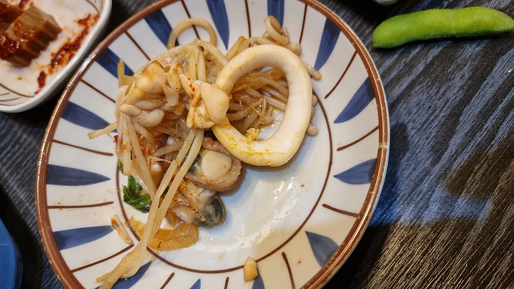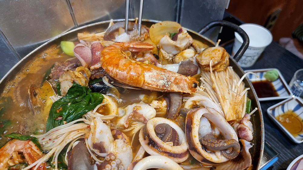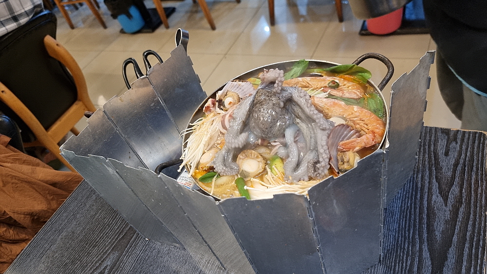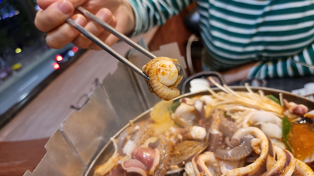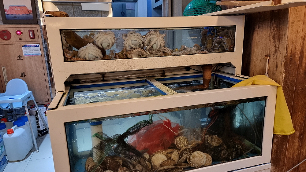 소주는 지역의 술이라는 대선소주를 주문했다. 지방에 왔으면 거기 술을 마셔주는 것이 또한 예의가 아니겠는가? 가격에 비해 구성이 아주 푸짐했는데 어느 정도 끓기 시작하면 주인장이 와서 해물을 손질해주었다. 오징어나 조개들을 적당한 크기로 잘라주고 빼주고 그랬다. 그리고 나중에 어항에서 살아있는 돌문어를 그대로 풍덩 해물탕 냄비에 빠트리는 방식이었다. 뜨거운 국물에서 몸부림치는 문어를 보면서 미안하다는 생각도 들었는데 주인장 왈 "그렇게 생각하면 암것도 못 묵씁니다." 하는 말을 들으니 수긍이 되었다. 하긴 식물도 고통을 느낀다는 설이 있다는데 정말 그런 것을 생각하면 암것도 못 먹는다.