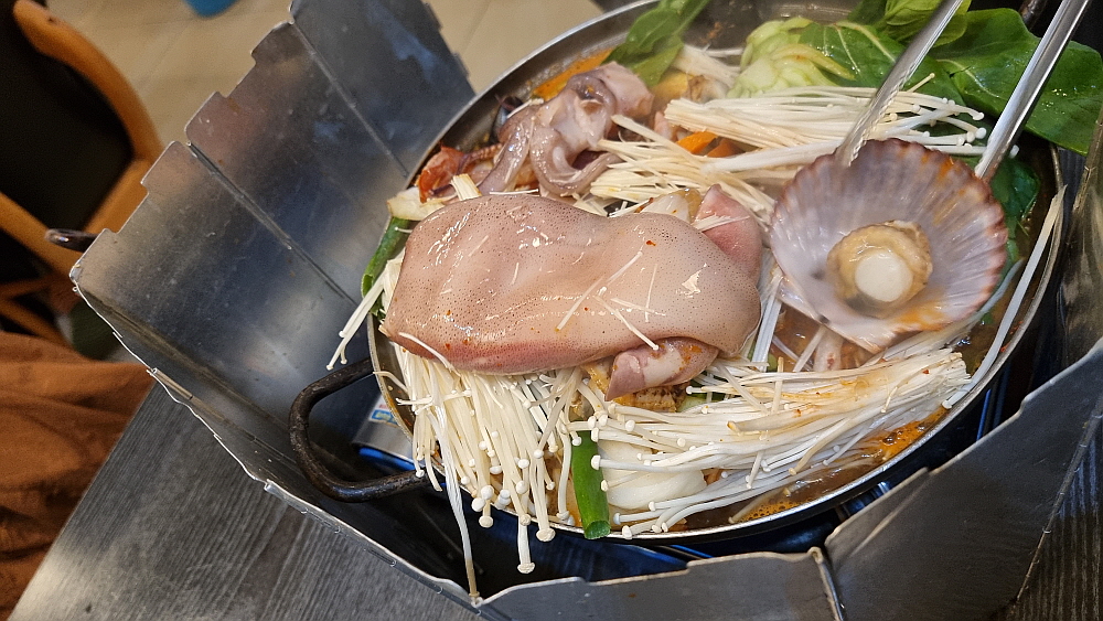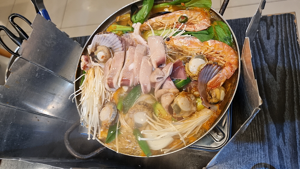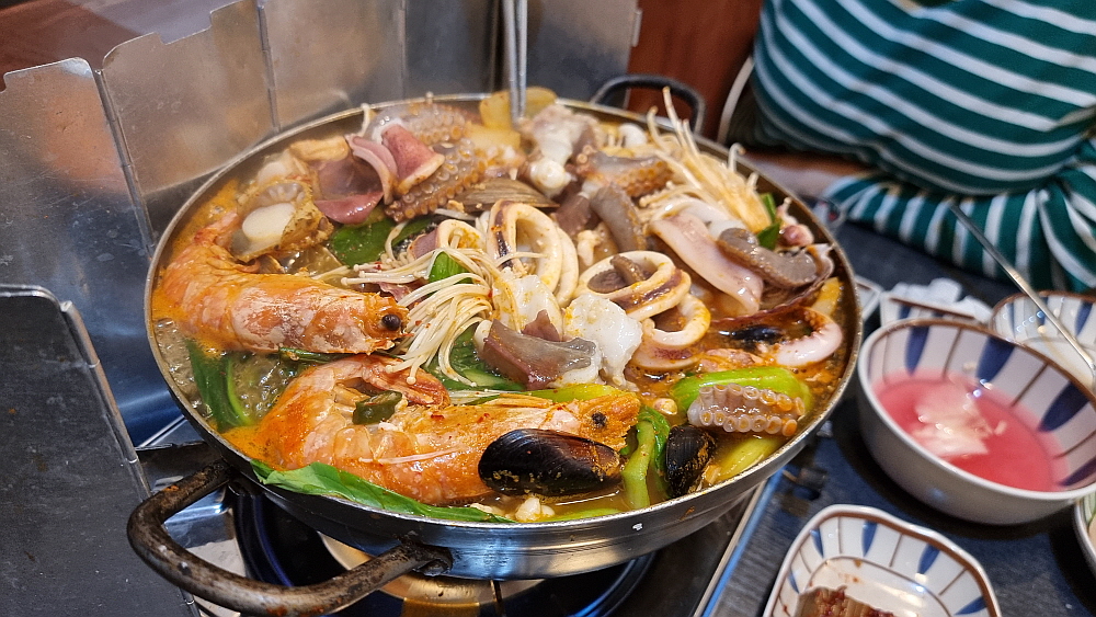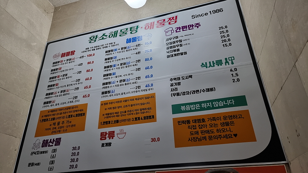 그래도 아주 관광객들로 넘쳐나는 시즌이 아니기에 그나마 다행이었다. 우린 바다를 보면서 먹기로 했다. 그래서 고른 집이 바로 이집, 황소해물탕, 해물찜 집이었다. 건물의 2층에 식당이 있기 때문에 일단 전망이 좋았고, 11월 임에도 선선하기만한 밤 기온도 창을 활짝 열고 식사할 수 있는 분위기를 만들어 주었다. 식당 자체는 세월의 흔적이 보였지만 해물탕이라는 좋아하는 아이템을 먹을 생각에 약간의 흥분도 있었다. 2만원을 더 주면 넣어 준다는 산 문어를 옵션으로 한 해물탕을 주문했다. 둘이 먹기에 적당한 크기라는데 가격을 그렇게 비싸지 않았다. 더우기 관광지라는 것을 생각하면 말이다.