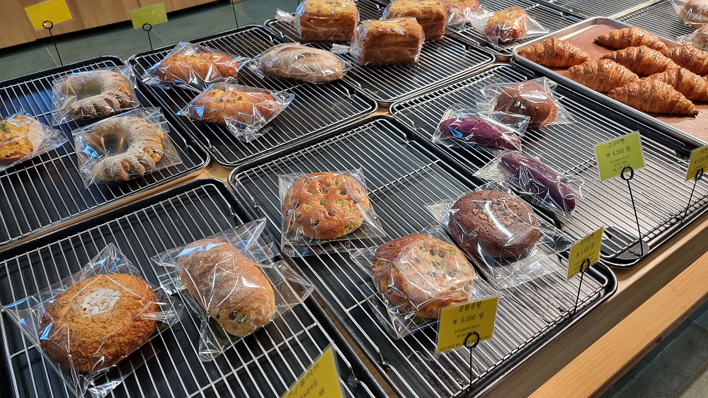 넓직한 실내에는 인공폭포도 있고, 작은 연못도 있다. 오후에 가서 그런지 빵이 별로 남아 있지 않았다. 얼마나 인기가 좋으면 만들어 내는 족족 이렇게 팔릴까? 우린 작은 패스추리 빵과 커피 두 잔을 사들고 그렇게 예쁘다는 2층으로 올라갔다. 다들 이런 분위기를 아는지 1층에는 손님이 하나도 없고, 모두 2층에 있었다. 커피 값이 6,000원 이면 결코 저렴한 가격은 아니지만 고모리라는 지역적 특징도 있고, 카페의 규모도 크고 하니 이 정도 가격이면 오히려 합리적인 편이라는 생각도 들었다. 1층에서만 주문이 가능하기 때문에 단체로 오면 다소 불편할 수도 있다.
