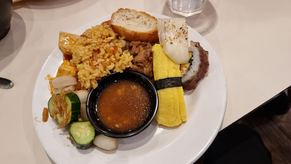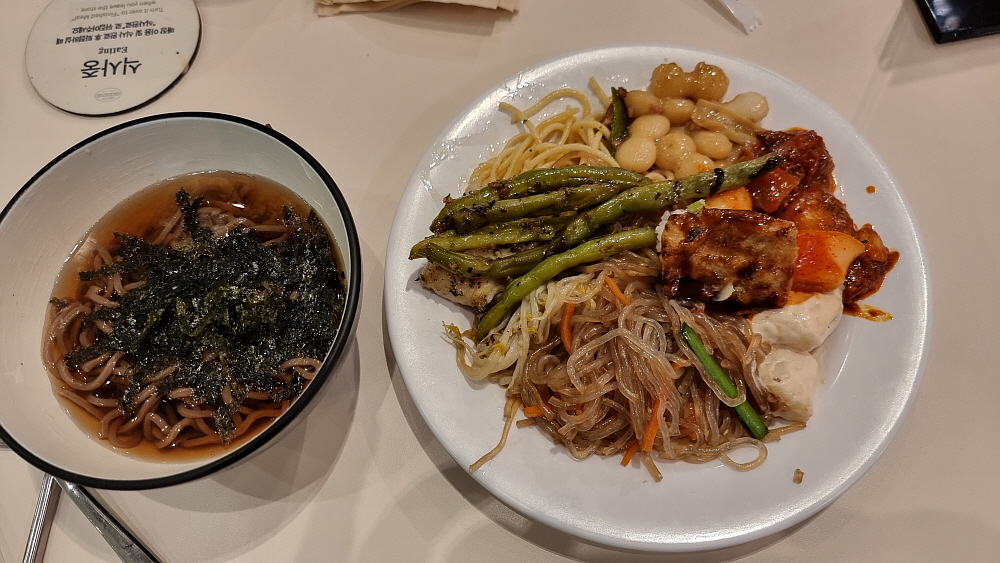 음식을 담아 온 접시를 보면 그 사람이 평소 무엇을 좋아하는지 알 수 있다. 그럼 만일 어떤 사람의 음식 취향을 알고 싶다면 부페를 데리고 오면 되는건가? 그냥 물어보면 되지 뭐하러 취향을 알기 위해 돈을 쓴단 말인가... 지혜롭지 못한 방법이다. 암튼 우리는 식탁에 앉아 서로 무엇을 담아 왔는지 살펴 보았다. 개인적으로 아무리 부페라 해도 우동이나 메밀소면 같은 국수는 꼭 먹는 편이라 가장 먼저 그것부터 가지고 왔다. 거기에 다시 면류인 잡채와 알리오 올리오 같은 기름 파스타를 담았다.이거 너무 국수 위주로만 편성한 것 아냐?