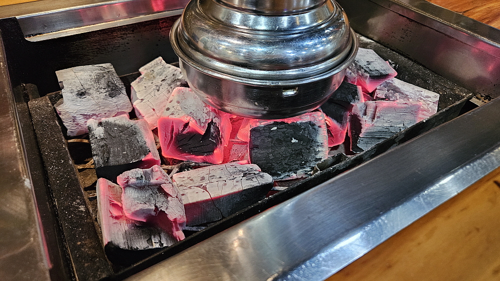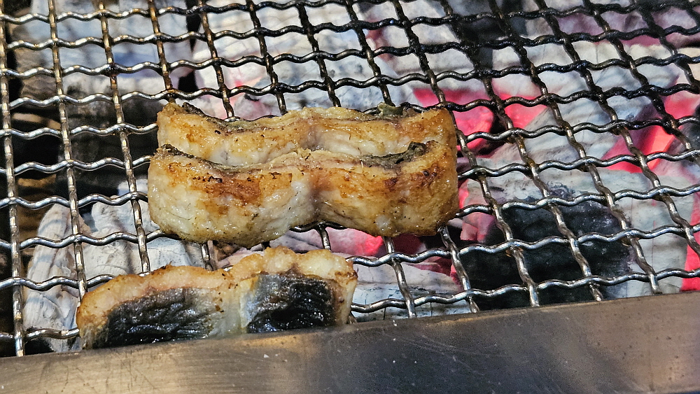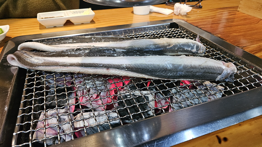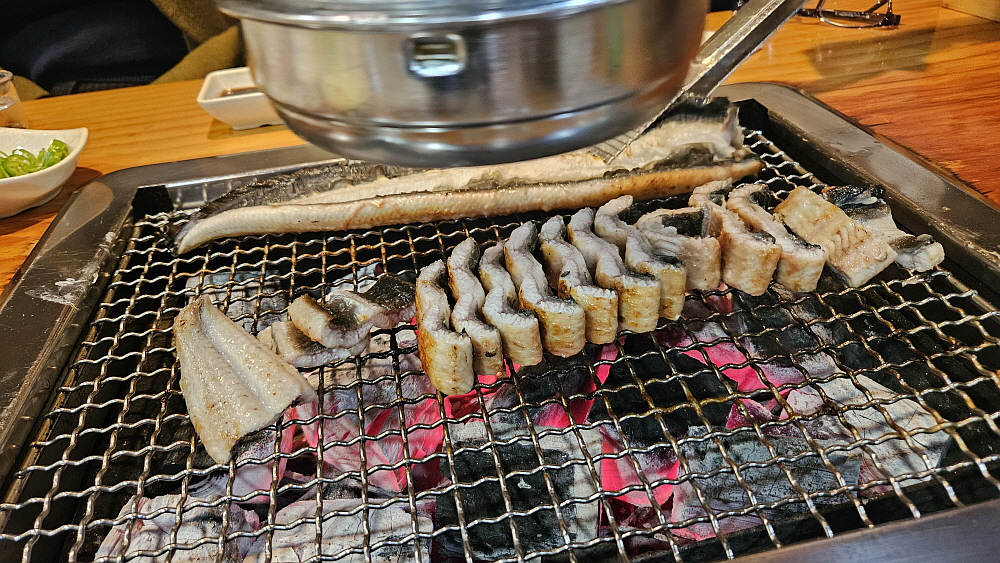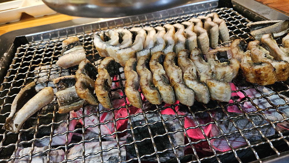 장어 가격이 올라서인지, 경기가 안 좋아서인지 예전과 달리 한창 먹을 시간인데 손님이 별로 없었다. 그렇게 사람이 많던 식당인데 정말 요즘 불경기가 심하긴 한가 보다. 가장 궁금했던 장어의 가격은 특대 사이즈, 장어 두 마리 기준으로 73,000원 이란다. 특대 사이즈는 1kg 정도 되는 무게이니까 생각보다는 그렇게 많이 오른 편은 아니었다. 요즘 좀 괜찮다는 삼겹살 집이 180g에 14,000원 정도 하니까 장어보다 오히려 삼겹살이 더 비싼 편이라 하겠다. 아무튼 벌건 숯불이 나오고, 좀 기다리고 있자니 드디어 우리가 그렇게 먹고 싶었던 장어가 나왔다.