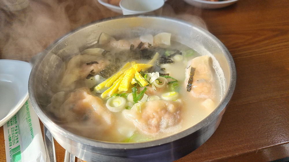 밑반찬이 정갈하게 나오고 드디어 기다리던 만두국이 나왔다. 이집의 만두는 정말 옛날식이었다. 김치가 들어가 있는 손으로 빚은 만두는 큼직한 것이 먹음직스러웠다. 계란지단과 김가루가 뿌려진 것이 전형적인 만두국의 비주얼이었다. 국물은 역시 생각한대로 곰탕 국물이었고, 만두는 왕만두급의 큰 사이즈로 6개나 들어있었다. 숟가락으로 저어 보니 밑에는 떡국떡도 제법 많이 들어 있었다. 이것을 다 먹으면 분명 엄청 배가 부를 것 같은 느낌이 드는 푸짐한 만두국이었다. 시골의 인심이 느껴지는 훈훈한 한 그릇이다.