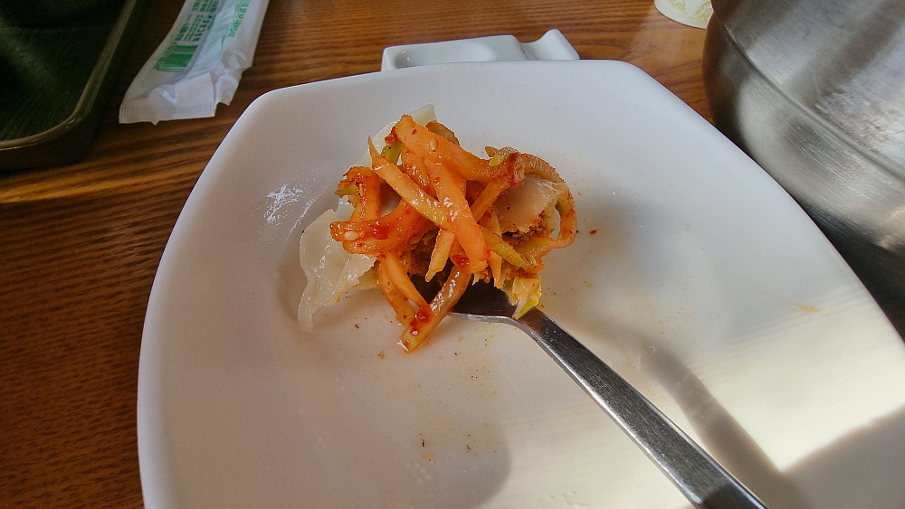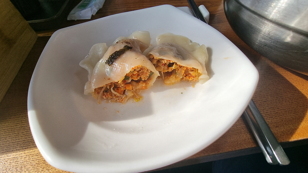 만두의 속은 역시 김치가 가득했다. 고기도 튼실하게 들어있고, 당면도 있다. 전형적인 만두의 모습이다. 예전에 장모님이 만들어 주셨던 전통적인 만두의 모양과 비슷한데 장모님은 김치의 국물을 미리 짜두어 만두속이 이렇게 뻘건 모습은 아니었다. 뭐가 되었든 상관없다. 집에서 어릴적 먹었던 만두를 오랜만에 만나 그저 반가웠을 뿐이다. 맛도 괜찮았다. 요즘식으로 말하면 단짠맵과는 거리가 있는 전통적인 맛이 강한 만두였다. 만두피도 두꺼워 한 개의 만두도 속이 터져 나온 것은 없었다. 만두속이 터져 나오면 그거야 말로 정말 속상한 일이기 때문이다.