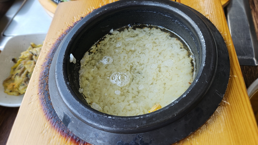 직접 굽지는 않는다 해도 잘 익은 장어를 생강과 마늘을 섞어 쌈을 싸먹는 맛은 정말 일품이다. 장어 좋아하는 사람들에겐 피하기 어려운 유혹이다. 낮에 먹는 점심상만 아니라면 술 한 잔 생각이 간절한 아이템이다. 장어 어죽도 먹고 싶었는데 그것은 다음 기회에 먹기로 했다. 어죽이란 음식이 무엇인가? 잘 익은 민물고기 살을 잘 발라 죽처럼 끓인 것 아니던가... 어죽이나 어탕국수나 모두 생선 좋아하는 사람들에겐 보양식 그 이상의 소원같은 음식들이다. 밥도 솥밥이 나온다. 밥알이 어찌나 탱글하던지 고기를 씹는 기분이 들 정도로 쫄깃한 식감이 아주 좋았다.