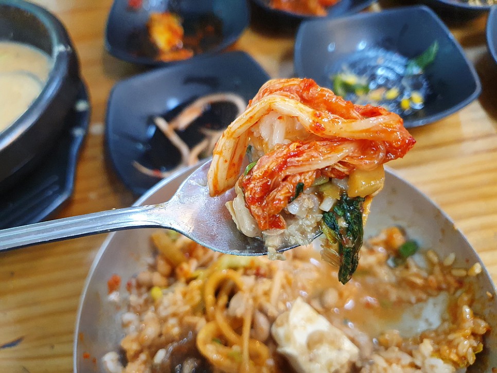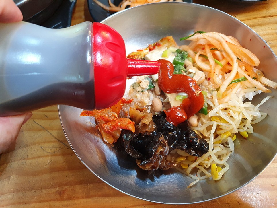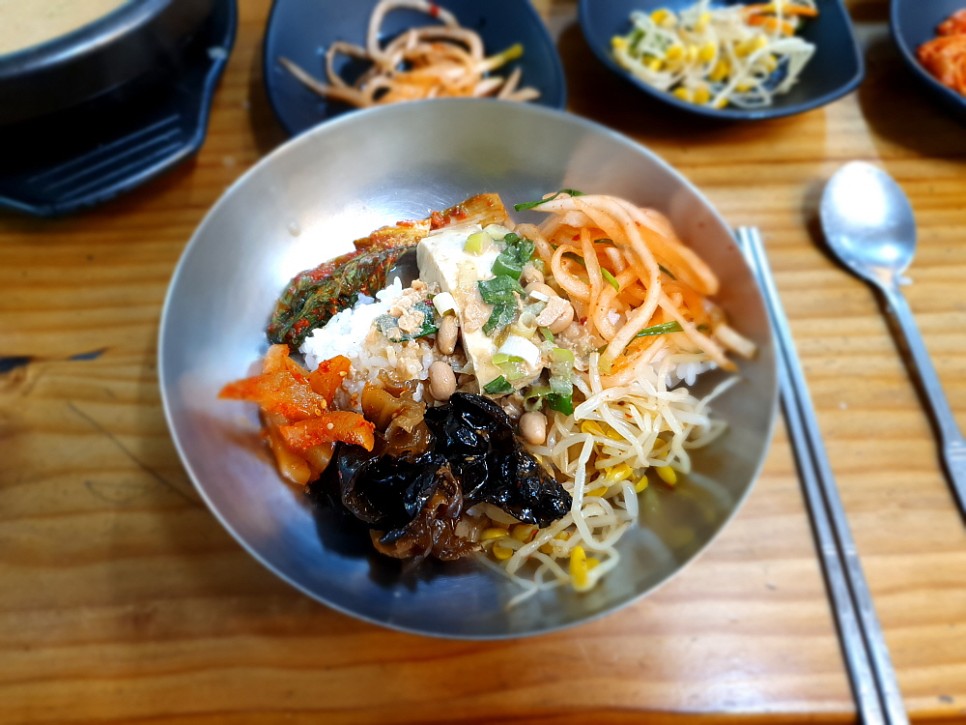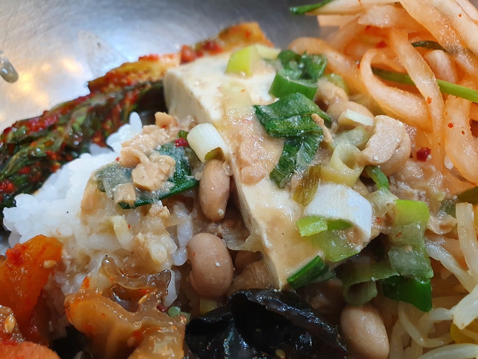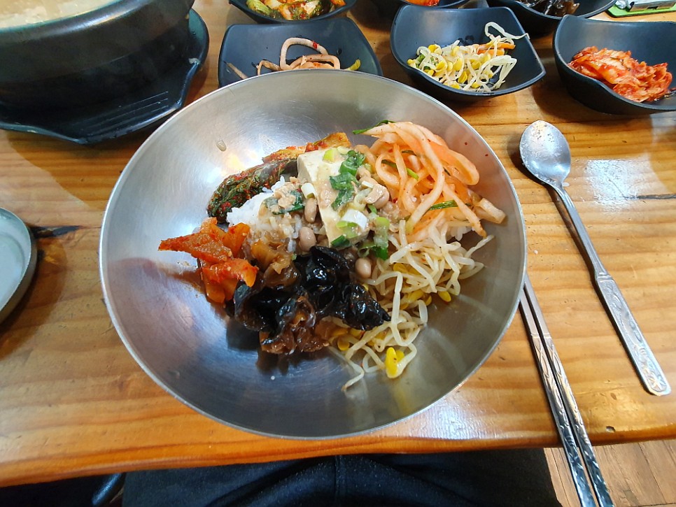 아마도 대부분의 손님들이 청국장을 먹을 때 밥 따로 청국장 따로가 아니라 비빔밥으로 한데 섞어 먹는 모양이다. 아예 처음부터 커다란 대접을 가져다 주었다. 거기에 공긱밥과 반찬, 그리고 대망의 청국장을 넣고 비벼 먹으라는 의미일 것이다. 역시나 다른 테이블도 모두 그런 식으로 먹고들 있었다. 우리도 뭐 망설일 것이 없었다. 밥과 반찬과 고추장을 듬뿍 넣고, 빠지면 서운한 참기름도 넉넉하게 넣고, 마지막으로 청국장과 두부를 섞어 열심히 좌로 우로 비벼댔다.