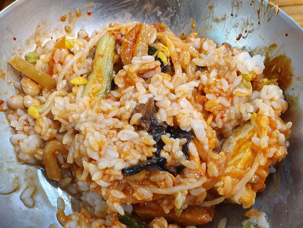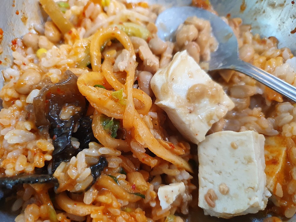 청국장의 물기 때문에 이렇게 비볐더니 일반적인 비빔밥 모양이 아니라 뭐랄까 개죽 같은 비주얼은 좀 아니다 싶은 모양이 되었다. 하지만 한 입 먹어보면 그 맛은 정말 미쳤다는 표현이 생각나는 것이다. 이런 청국장 비빔밥을 싫어할 사람이 있을까? 고추장을 과하다 싶을 정도로 많이 넣었는데도 청국장이 워낙 고소하고 구수하니 그 고추장의 알싸한 맛을 거의 중화시켜 버렸다. 그래서 어디서도 먹어 본 적이 없다 싶을 정도의 새롭고, 맛있는 비빔밥이 되었다.
