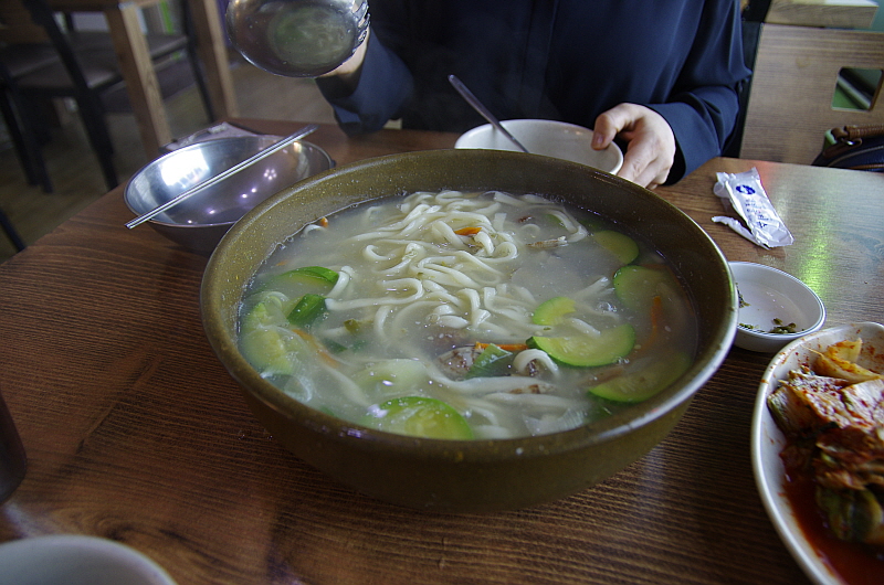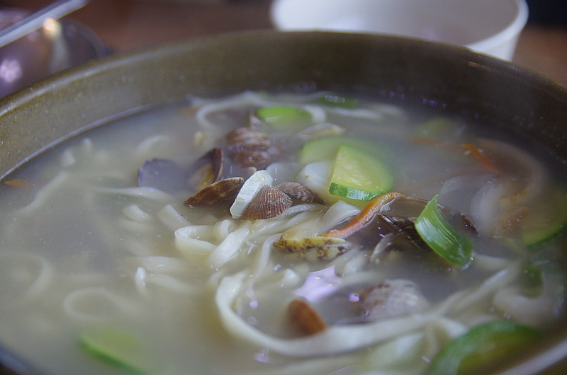 꼭 그런 것은 아니지만 바지락 칼국수는 사실 호박이나 감자같은 야채를 많이 넣지 않는 것이 정석인 것 같다. 바지락 특유의 향과 국물의 맛을 음미하기 위해서다. 고소하면서 달달하고 해산물의 향이 진한 제대로 된 바지락 국물은 조금 짜다는 단점에도 불구하고 계속 손이 가게 만드는 묘한 매력을 지녔다. 하지만 이날의 바지락 국물은 그런 우리의 기대에는 조금 미치지 못했다. 야채가 너무 많이 들어간 모습에서 이런 바지락 정통의 국물맛에서 뭔가 모자라다는 느낌을 강하게 받았다. 그리고 바지락이 너무 작았다. 음 산지는 맞는데 왜 이러지?