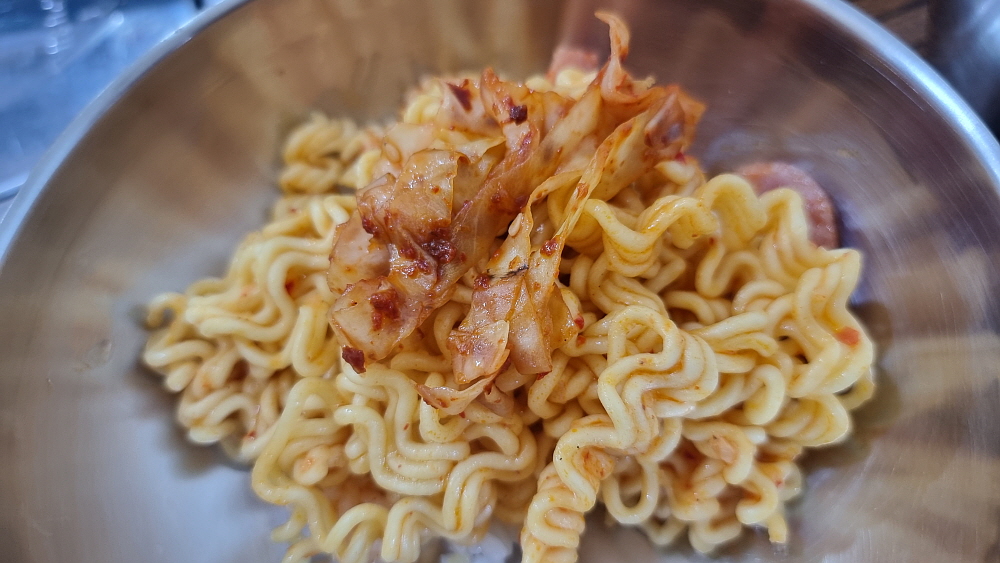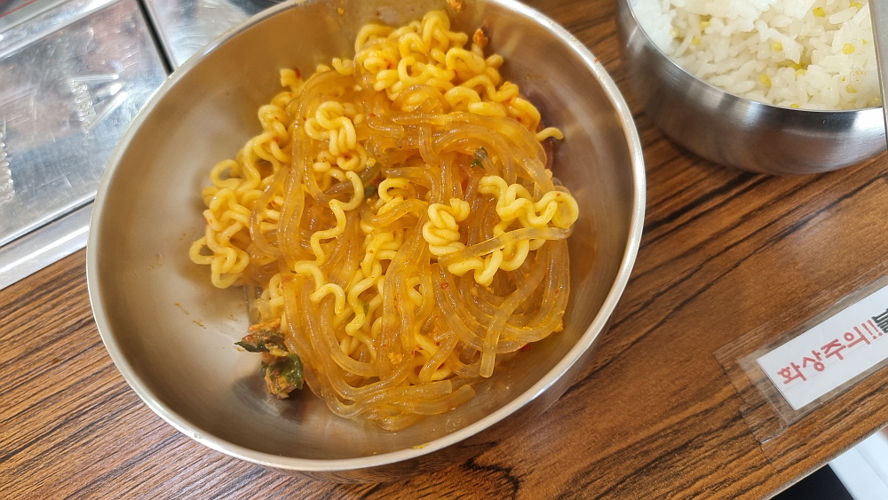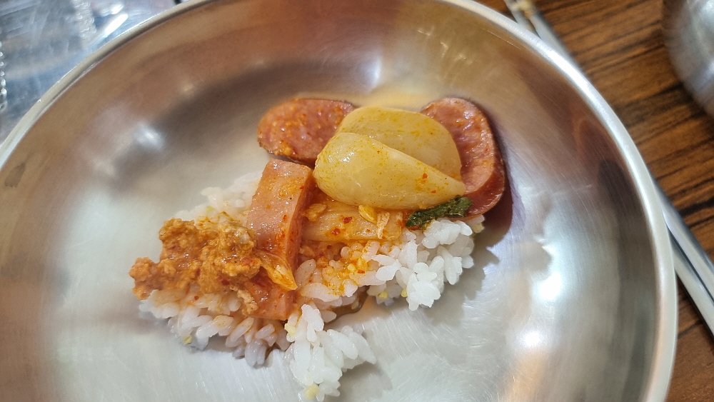 부대찌개의 영원한 단짝인 라면사리도 역할을 톡톡히 한다. 밥먹는 것을 잊을 정도로 내용물이 많아 즐겁게 건져 먹을 수 있다. 금새 식당 안은 손님들로 채워지고 모두들 부대찌개를 앞에 놓고 머리를 조아리듯 먹는 모습이 단체로 함께 온 손님들같다는 생각이 들게 했다. 함께 밥을 먹는 사이가 식구라고 한다면 이날 이시간 우리는 모두 식구들이 맞는 것 같다. 진득하고 묵직한 국물은 밥과 함께 먹을 때 빛을 발한다. 국물이 워낙 진하니 술 생각도 난다. 하긴 여기서 저녁 회식도 몇 번 했던 것 같다. 소시지와 햄, 그리고 진한 고기 맛의 국물이 어우러지는 든든한 한끼였다.