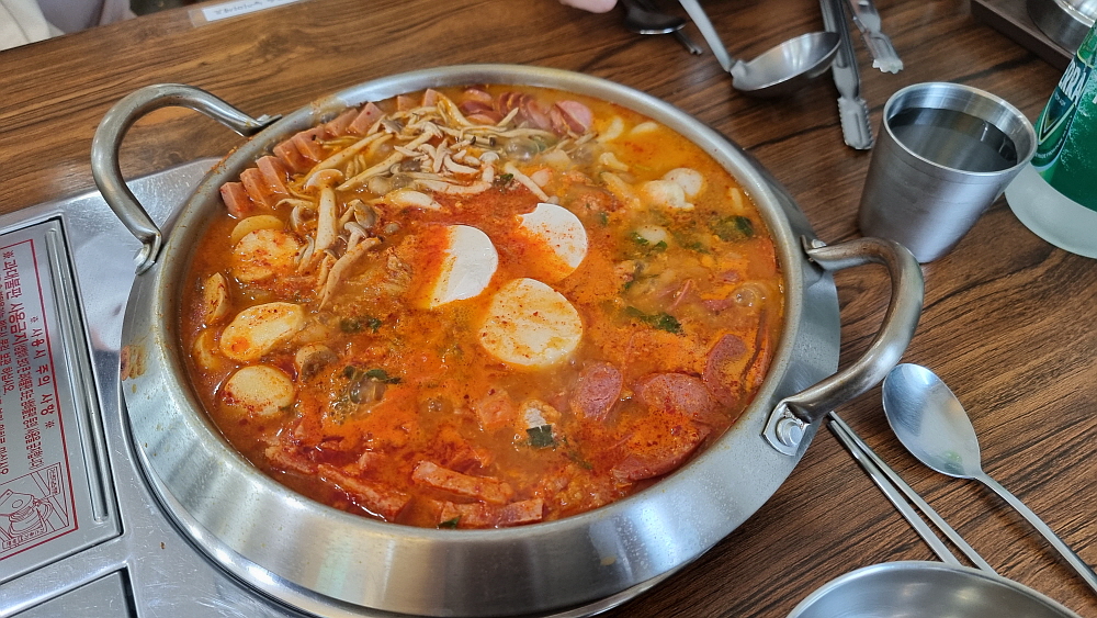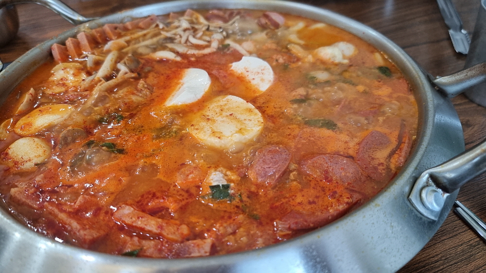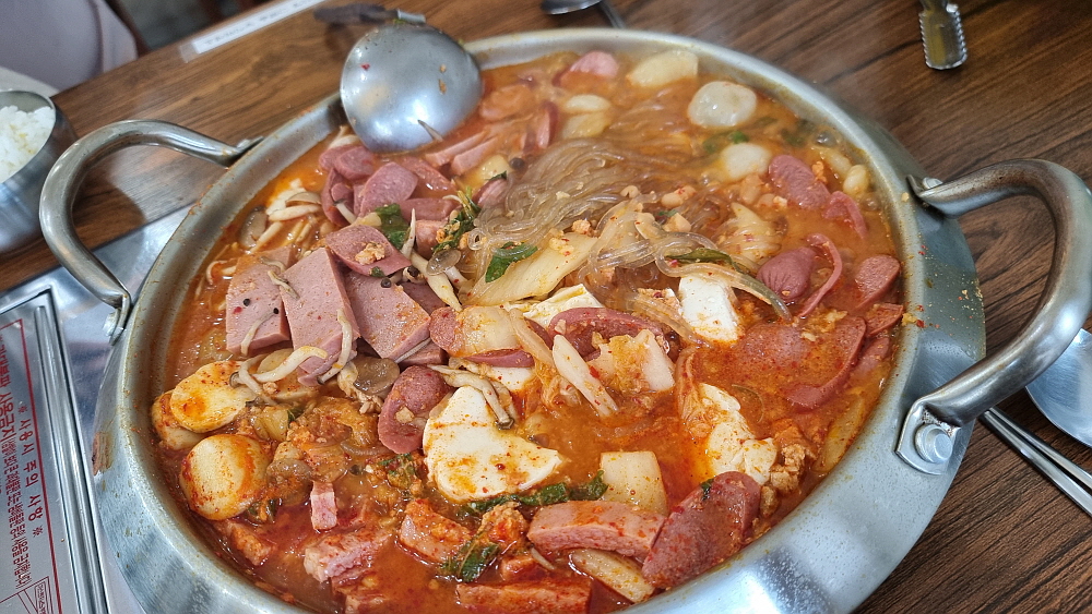 실내 홀이 작은 편이기 때문에 예약을 하지 않으면 문앞에서 먹거나 아예 들어가지 못할 수도 있다. 그래서 안쪽에 방이 마련되어 있기는 하다. 하지만 편하게 식탁에 앉아 먹고 싶으면 미리 가거나 예약해야 한다. 부대찌개 외에 별 다른 메뉴가 없는 집이기 때문에 우린 당연히 부대찌개와 라면사리를 주문했다. 어느 정도 끓여 나오는 방식이라 찌개가 나오는데 약간의 시간이 걸린다. 찌개의 구성을 살펴보니 특이한 것이 있었다. 순두부가 들어가 있고, 느타리 버섯도 있다. 떡도 많이 들어간 편이고 김치도 있다. 의정부 방식이라 하기도 그렇고, 송탄 방식이라 하기도 그렇다.