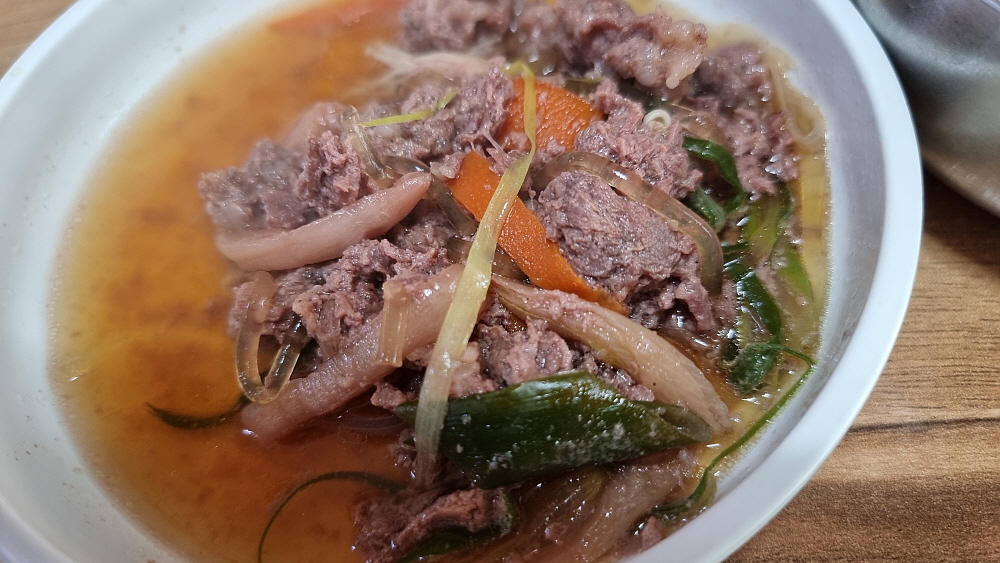 당면과 파와 당근같은 야채가 듬뿍 들어간 달달하고 고소하면서 부드러운 불고기가 완성되었다. 서둘러 당면부터 건져 먹으면서 국물을 한껏 퍼서 밥에 담아 본다. 밥알에 솔솔 배어드는 불고기 국물의 맛이 정말 일품이다. 야채가 많이 들어 있어 고기를 먹지만 양심상 전혀 꺼리낌이 없는 한 끼가 된다. 우린 몸에 좋은 야채를 고기와 함께 듬뿍 먹었다는 말이다. 고슬 고슬한 밥에 달달한 불고기 국물을 부어 먹는 것 자체가 아주 사치스러운 밥 한 끼가 되는 비주얼이다. 야들 야들한 고기는 비록 수입산이지만 소고기로서의 품격은 그대로 간직하고 있다.