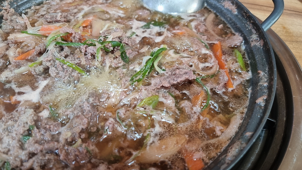 우리가 주문한 것은 국물이 흥건하게 들어 있는 불고기이다. 예전에 이집에서도 가운데 부분이 불룩하게 올라간 불고기 전용 용기에 담아 내어주었다. 하지만 이젠 그냥 넓적한 냄비에 담아준다. 뭐 상관은 없다. 솔직히 개인적으로는 고기 자체보다 국물이 더 좋기 때문에 이렇게 국물이 국밥처럼 많이 들어간 불고기를 참 선호한다. 어릴적에도 불고기 국물에 밥을 비벼 먹는 것을 꽤나 좋아 했었다. 불고기가 익기 전에 먼저 나온 반찬들로 약간의 에피타이저를 삼으며 밥 몇 숟가락을 먹고 있노라면 드디어 우리의 메인메뉴인 불고기가 완성된다.
