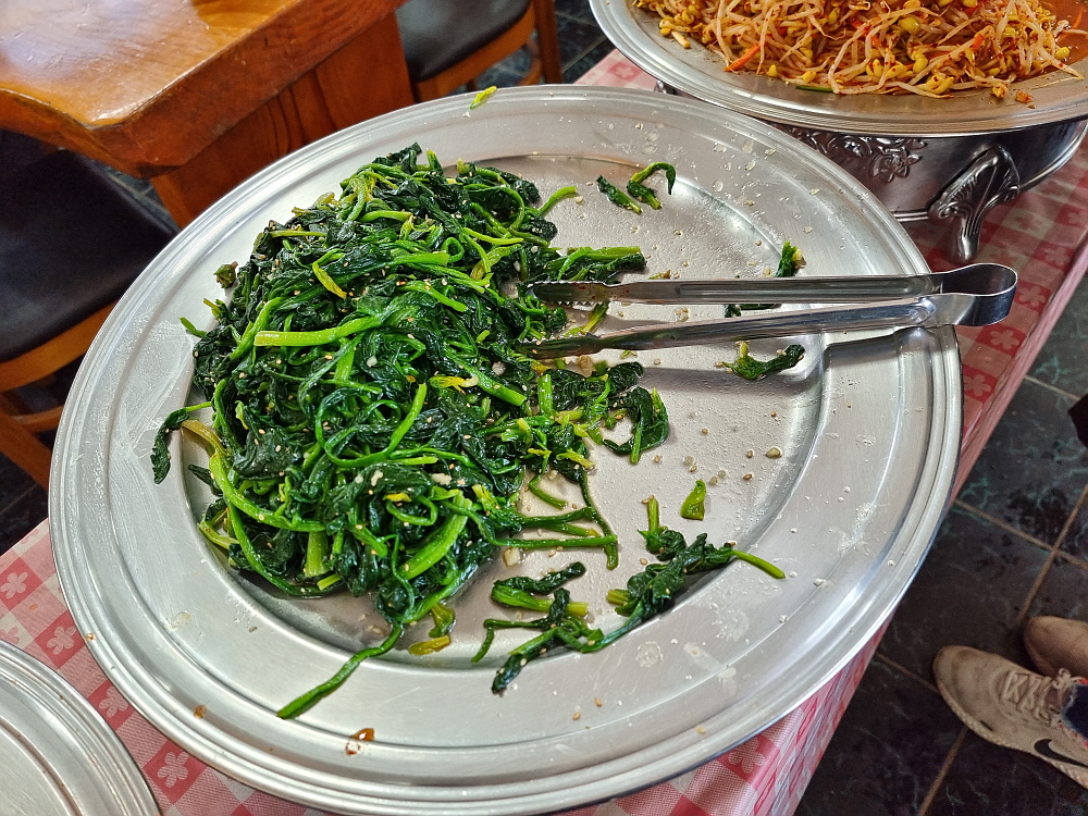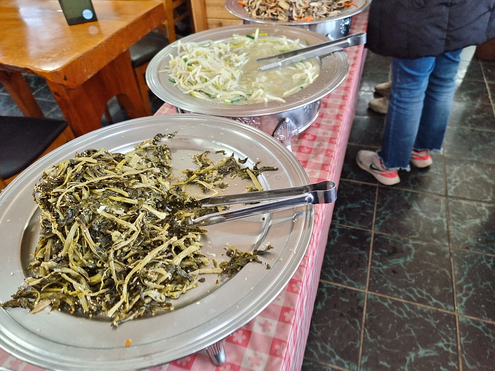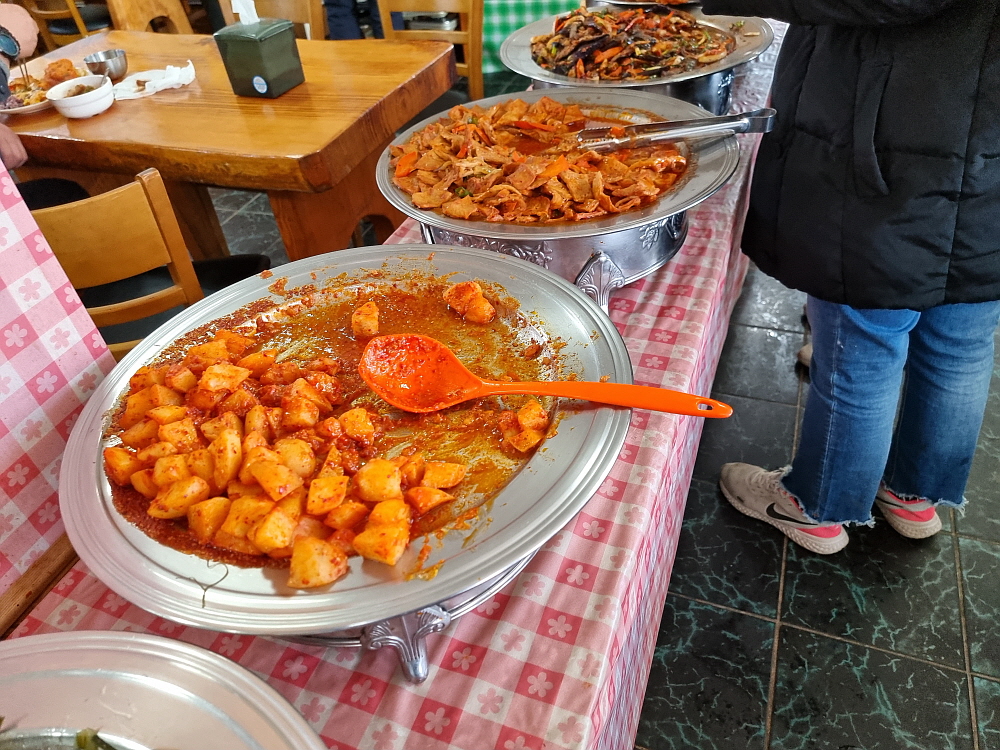 물론 산해진미로 차려진 부페는 물론 아니었지만 나물을 워낙 좋아하는 사람 입장에선 고기나 생선이 그득한 익숙하게 보아온 비싼 가격의 부페보다 오히려 이런 구성이 더 맘에 들었다. 하지만 여기선 초심을 잃으면 안 된다. 정신없이 담다 보면 금새 접시가 가득해지기 때문이다. 그래서 마음을 가라 앉히고 천천히 생각하면서 반찬들을 집어야 한다. 그렇게 숨을 고르면서 반찬을 담았는데도 금방 접시는 더 이상 뭘 담을 수 없을 정도로 그득해졌다. 그런데 반찬을 다 집고 보니 맞은편에는 찌개와 국, 그리고 계란 후라이와 깻잎같은 밑반찬들이 또 있었다. 심지어 제육과 쌈도 있었다. 정말 대단한 집이다.