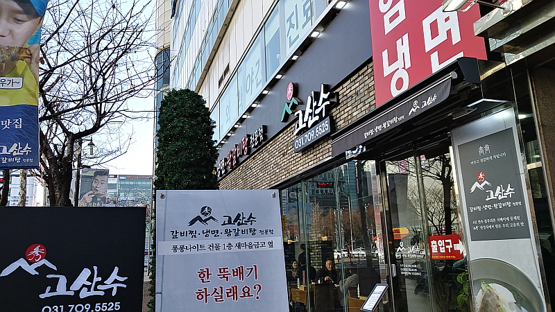 아들을 만나기 위해 또 성남으로 향했다. 이제 3월에 아들이 제대하면 이렇게 자주 여길 올 일은 없을 것이다. 내가 대학 다니던 80년 대 이후 이렇게 뻔질나게 성남을 다닌 적은 없었다. 성남은 나에겐 그리 낯선 동네는 아니지만 그 때의 다소 어수선하고 달동네 같던 분위기는 싹 사라지도 마치 서울 강남의 어디 같은 부티나는 동네가 되었다. 성남 시외버스 터미널은 홈플러스가 함께 붙어 있어 정말 이곳 분당에서도 사람이 참 많은 곳이다. 사람이 많으면 식당도 술집도 많게 마련이고 맛집도 많다. 이날 원래 계획은 아들이 봐 두었다는 돈가스 집을 가는 것이었으나 불행히도 그집은 문을 열지 않았다. 그래서 선택한 곳이 바로 이곳 고산수 라는 갈비탕, 도가니탕, 냉면을 파는 집이었다. 여기도 꽤나 유명한 집이라고 했다.