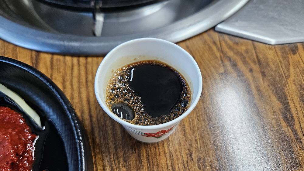 개고기도 그랬지만 염소고기도 가격이 비싼 편이다. 하지만 여긴 탕 한 그릇에 9,900원이다. 영업적인 전략이겠지만 이렇게 가성비가 좋아서인지 손님들이 제법 많았다. 우린 술을 마시기 위해 찾은 것이라 전골과 수육을 주문했다. 이렇게 주문하면 탕을 주문하는 것과는 달리 엄청 견적이 올라간다. 전골 두 개에 5만원이고, 수육이 3만원이나 하니 일단 안주로만 8만원이 나오는 셈이다. 당구 내기 치고는 너무 과한걸... 하지만 어쩌랴 이날의 승리를 이렇게 풀기로 한 것을~ 자리에 앉으면 일단 염소진액을 내어준다. 이것은 요즘 염소고기집에서는 유행처럼 주는 것이란다. 마치 한약 탕재를 먹는 것 같은 기분이다.