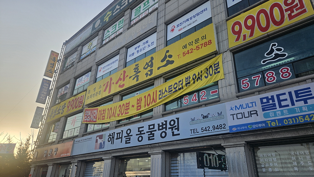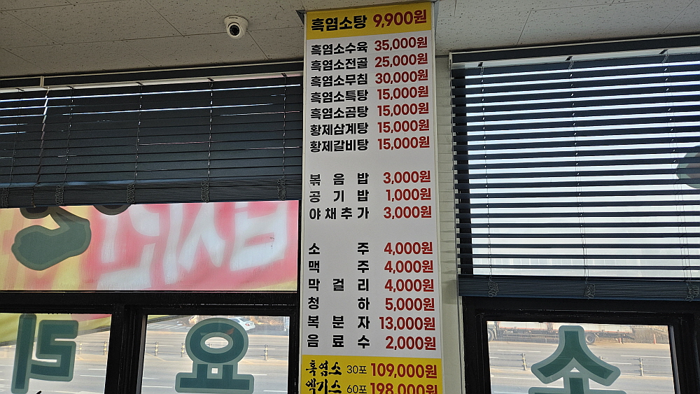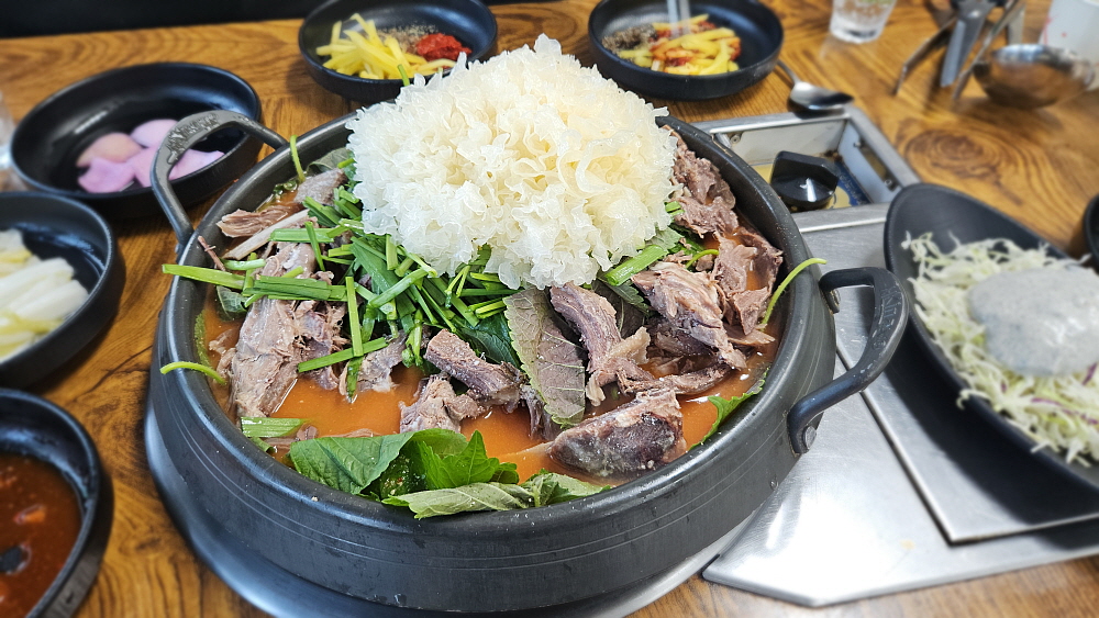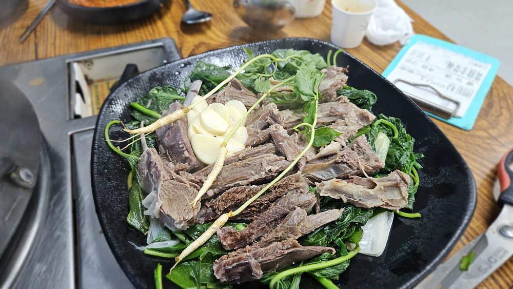 보신탕이 법적으로 먹을 수 없는 음식이 되자 사람들은 비슷한 식감에 영양도 좋다는 염소고기를 먹기 시작했다. 일부러 개고기 같은 식감을 내려고 그런 것인지 아님 원래 염소가 개고기랑 비슷한 맛인지는 몰라도 아무튼 개나 염소는 구분하기 힘들 정도로 식감이 비슷하단다. 동네에서 한 두 개 정도 보이던 보신탕 집들은 사라지고 그 자리를 염소탕 집들이 채우고 있다. 이날 우리가 간 집도 원래 가산에서 보신탕으로 유명했던 집이다. 얼마 전 소흘읍 사무소 근처로 이전하고 상호도 '가산흑염소'라 변경했다. 이젠 완전히 염소고기 전문점이 된 것이다. 여길 가려고 몇 번이나 시도했었는데 드디어 이날 가게 되었다. 역시 당구는 이기고 봐야 한다.