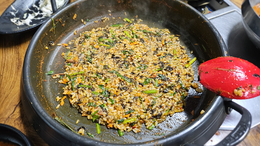 그리고 마지막 하일라이트는 역시 한국인의 레시피인 볶음밥이었다. 전골 국물에 밥을 볶아 먹는 것인데 이상할 정도로 볶음밥은 맛이 다 비슷하다. 감자탕이나 삼겹살이나 해물탕이나 이날 먹은 염소전골이나 밥을 볶으면 어떻게 그렇게 비슷한 맛이 나는지 모르겠다. 제일 마지막에 먹기 때문인지 몰라도 언제나 볶음밥의 여운이 진하게 남는다. 그냥 덤으로 먹는 것이지만 제일 맛있다는 생각이 온통 머릿속을 채우게 된다. 이것도 신기한 일이다. 소주를 꽤나 마셨지만 역시 염소가 좋다는 이유가 있는 모양이다. 거뜬하다는 생각이다. 가격이 좀 나가기는 하지만 이날 먹은 가산흑염소 꽤나 회식장소로 좋다는 느낌이 솔솔~