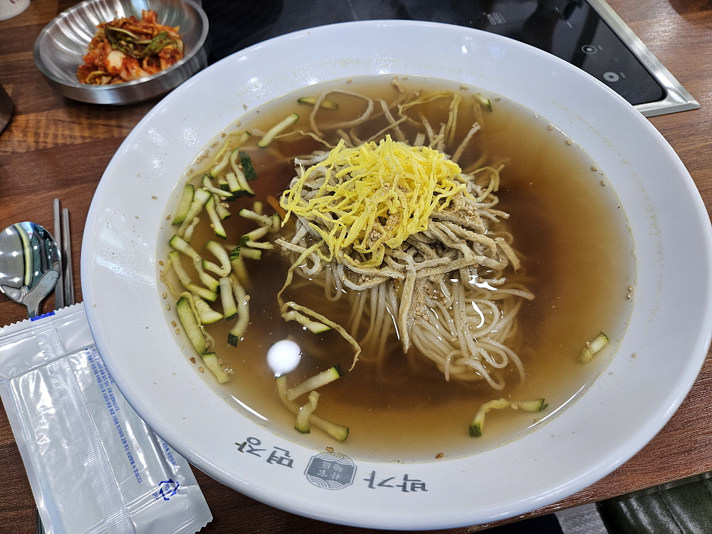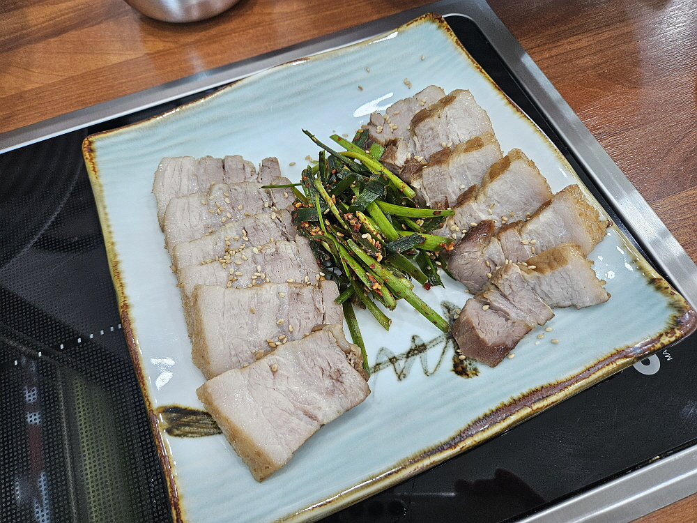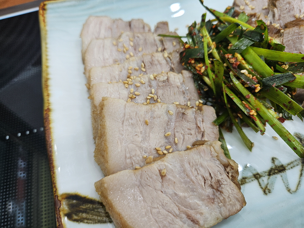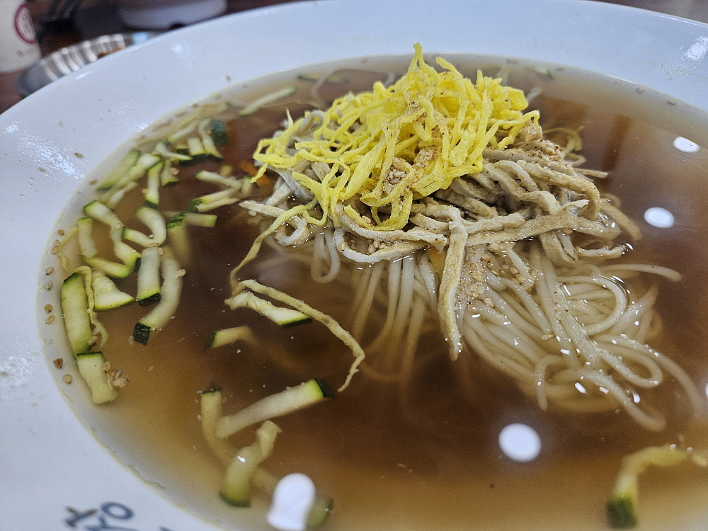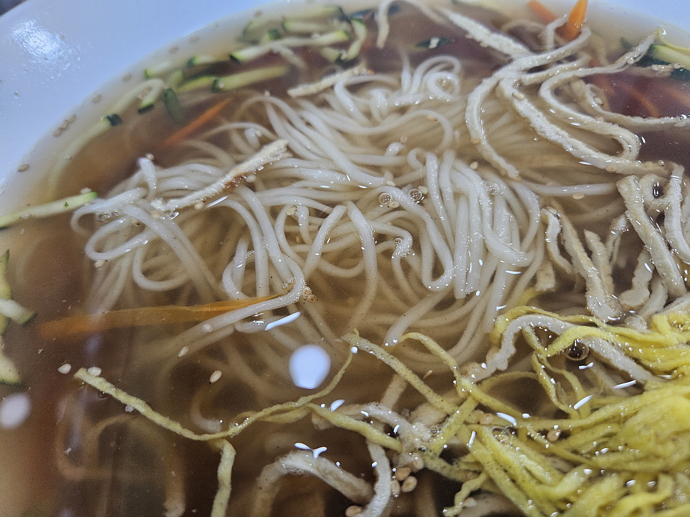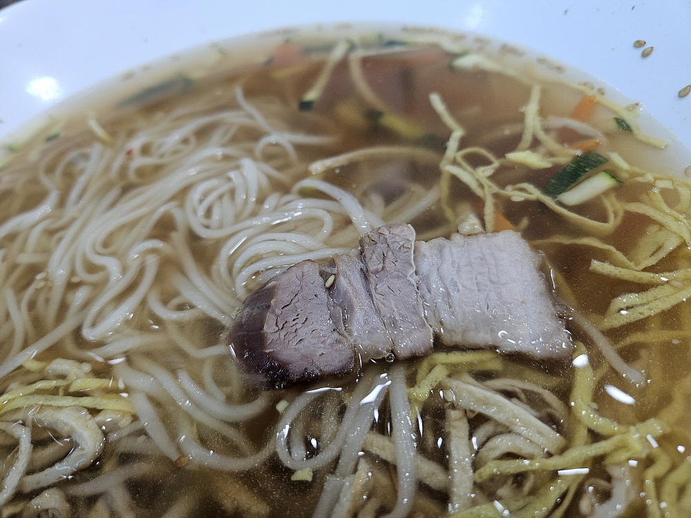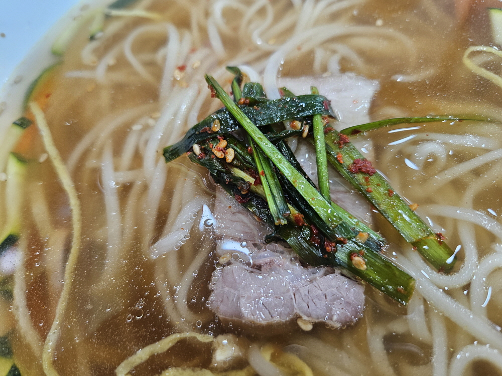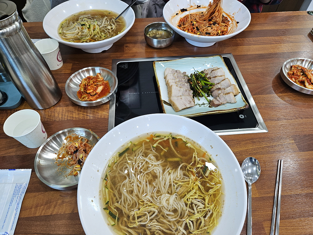 계란지단이 엄청나게 고명으로 들어간 국수였는데 먹어보니 식감도 일반적인 소면이나 중면과는 달랐다. 역시 면을 직접 만들어 쓰는 모양이다. 국물도 흔한 멸치육수는 아니었다. 뭔가 다른 재료들이 더 들어가 맛이 혼합된 복합적인 것이었다. 이렇게 창의적인 국수를 만들기 때문에 체인사업을 하는 것이겠지... 박승광 해물칼국수도 여러번 가 봤는데 거기도 면을 직접 만들어 쓰는 것 같았다. 면발에는 진심이 있는 곳이라 하겠다. 우리는 잔치국수와 비빔국수, 그리고 맛보기 수육도 주문했다. 보통 국수집에선 보기 드문 수육을 먹어 볼 생각이었다.