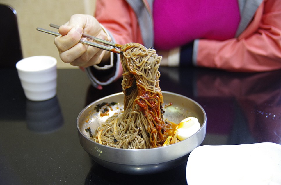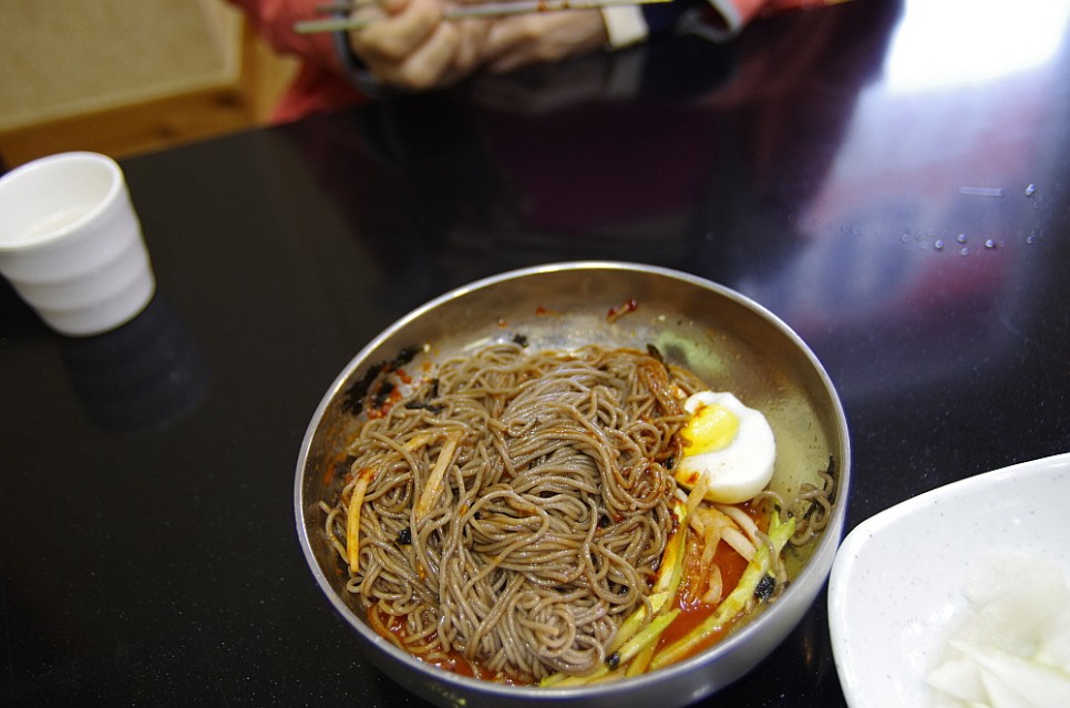 이번에 주인공인 막국수 차례다. 강변막국수의 면은 100% 메밀은 아닌 것 같았다. 마치 냉면처럼 찰기가 있었다. 메밀만으로 이런 쫀득함을 얻을 수는 없는 노릇이니 아마도 다른 무엇인가를 섞었을 것이다. 그래서 막국수라고 하지만 마치 냉면을 먹는 식감도 살짝 났다. 그러면서 메밀 특유의 알싸한 향도 살아 있었다. 개인적으로야 메밀 100%의 툭툭 끊어지는 면을 좋아하지만 이런 일종의 퓨젼형의 면도 좋아한다. 비교하자면 철원에서 먹었던 동송막국수와 정말로 아주 비슷한 맛이었다. 마치 두 집이 한 집안 사람인 것 같은 그런 느낌이었다.