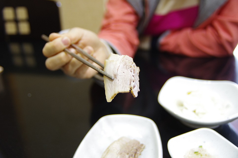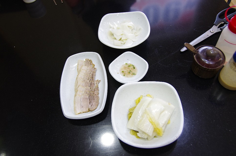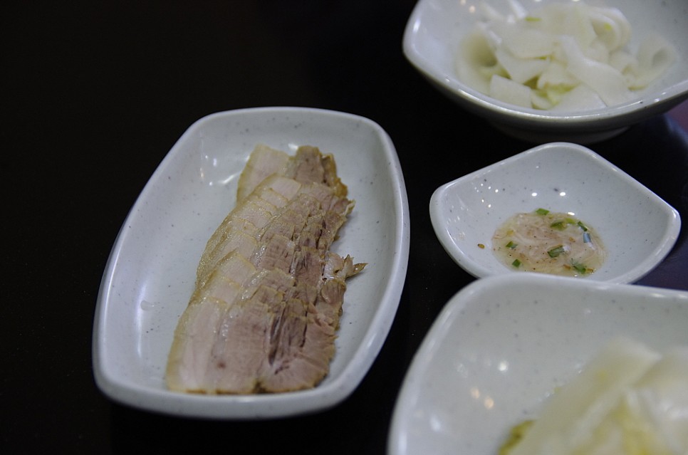 우리는 물막국수와 비빔막국수를 주문했다. 늘 이런 식이긴 하다. 그런데 정말로 수육이 나왔다. 양이 많은 것은 아니지만 비주얼이 장난이 아니었다. 서비스로 주는 고기라고는 믿기지 않는 고급스럽고, 제대로 된 돼지고기 수육이었다. 한 점 먹어보니 맛도 그만이었다. 잡내도 전혀없고, 야들 야들한 수육고기의 식감은 그대로 살아 있었다. 우리가 비교적 이른 아침 시간에 이곳을 왔지만 수육을 보니 다시 알콜 생각이 나기 시작했다. 음,,, 이러면 안 되지~