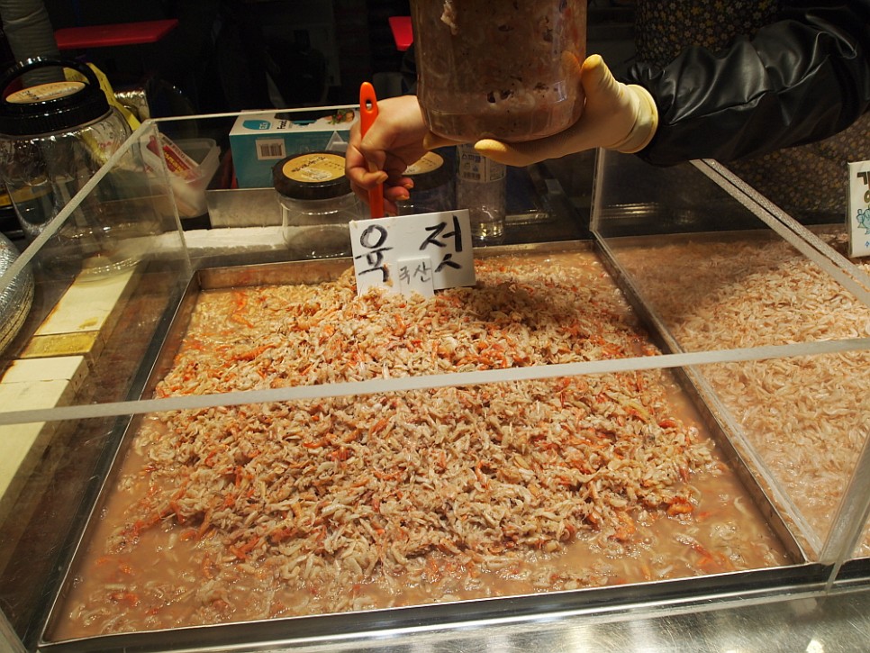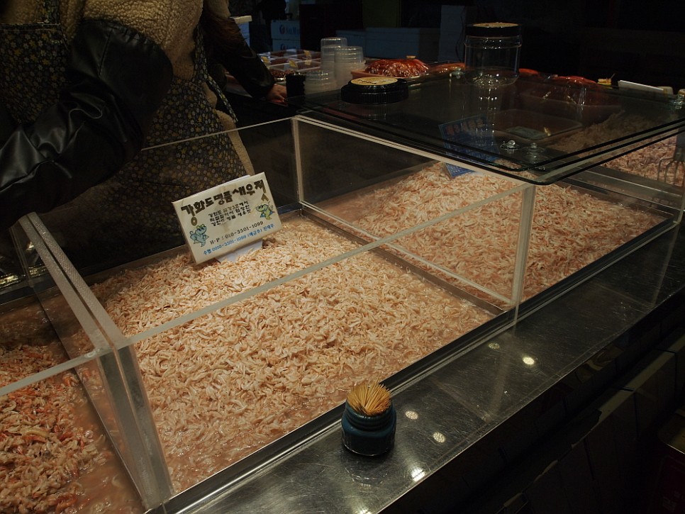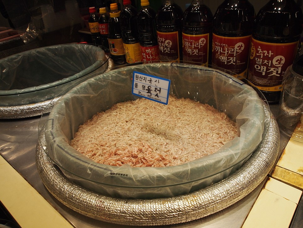 우리는 다슬기처럼 생긴 달팽이도 한 그릇 사들고 요기를 마무리 했다. 원래 오늘 우리가 여기 온 목적은 새우젓이었으니 다른 아이템은 마다하고 일단 젓갈을 파는 곳으로 발길을 옮겼다. 한 섹터가 모두 젓갈을 파는 곳인 이곳은 다른 어물전보다 특히 젓갈 코너가 인기가 좋은 것 같다. 그중에 한 곳 깔끔해 보이고, 맘씨 좋아보이는 안동가게라는 곳에서 흥정을 시작했다. 보기 좋은 육젓은 아예 말을 붙이기 어려울 정도로 비쌌다. 보통 오젓이니 추젓이니 하는 애들이 1kg에 2만 원 정도라면 육젓은 6만 원 이상 8~9만 원까지 호가했다. 이러면 몸 값이 얼마나 차이나는 것인가... 있는 사람들은 젓갈도 저런 것만 먹겠지? 음 아무려면 어떠랴 우린 우리가 원하는 것은 합리적인 가격에 사면 되는 것이다.