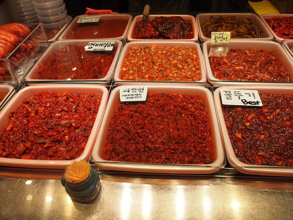 주인장은 보기엔 약간 모양이 깨진 것처럼 보이지만 맛은 좋다는 이곳의 브랜드 젓갈을 추천했다. 이것은 1kg에 만 원 밖에 안 된단다. 너무 싸서 망설이고 있었더니 맛을 보라해서 몇 마리 집어 먹었다. 그런데 정말 깊은 맛이 나는 것이 내 입엔 착 붙는 것 같았다. 주인장 말대로 김치나 찌개를 할 것이라면 모양이 없어도 맛만 좋으면 되는 것 아니겠는가? 그래서 과감하게 2kg 을 담기로 했다. 가성비 좋은 물건을 사서인지 기분이 좋아져 우린 창란젓과 무우말랭이까지 샀다. 이집 주인이 장사를 잘 하는 것인지 우리가 순진한 것인지 몰라도 조금 서비스로 주는 깻잎무침에 감동받아 원래 계획보다 더 많은 물건을 사고 말았다.